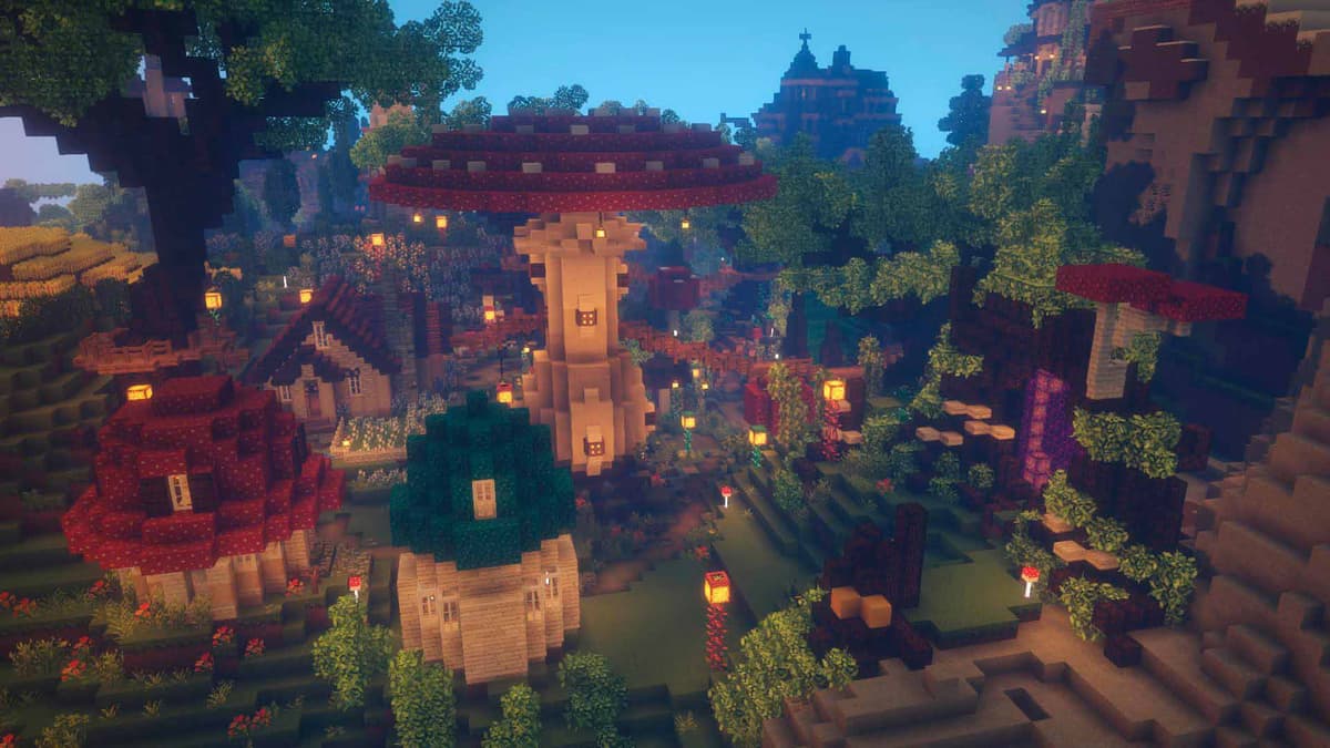 Сказочная палитра и мягкое свечение. Грибные кварталы, круглые окна, нависающие «шляпки» — всё выглядит уютно и немного нереально.