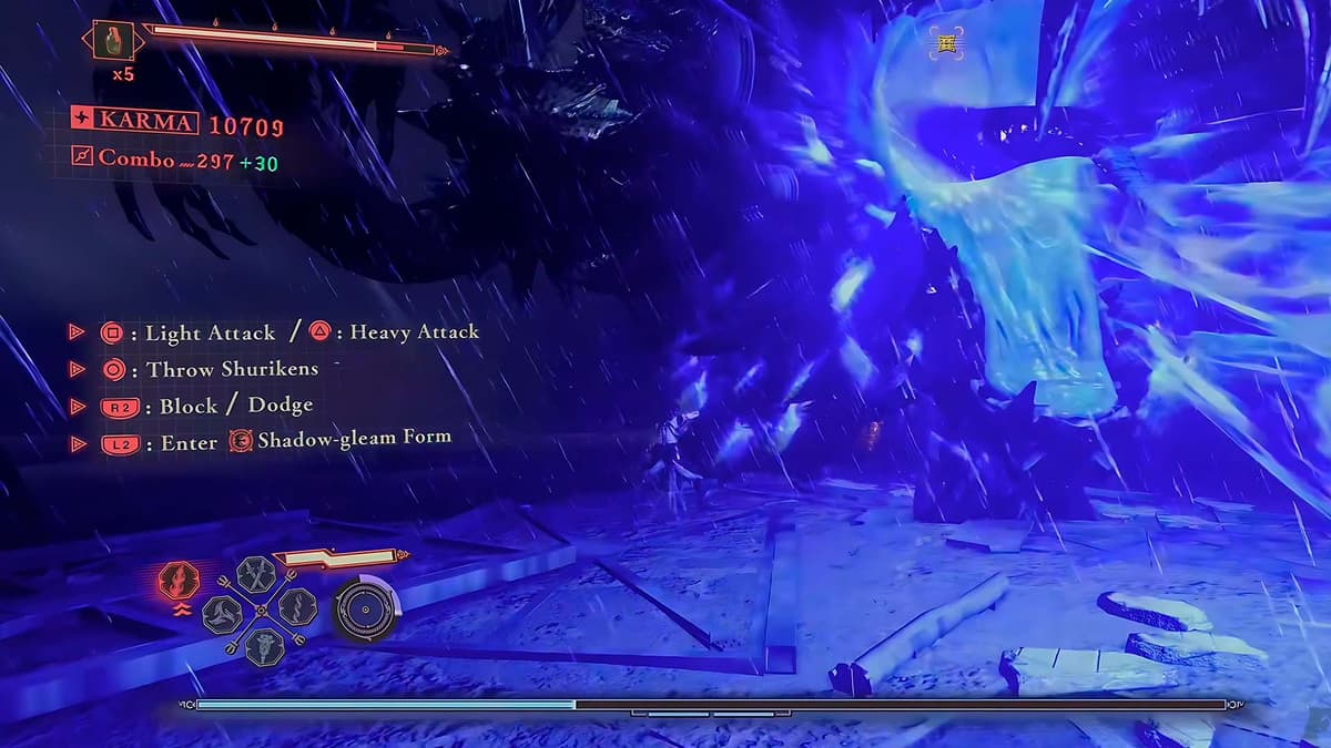 5. Ninpo — как кнопка паники и под смены фаз. Береги ресурсы и жми Ninpo на самых опасных паттернах (включая затяжные круговые/дальние серийные атаки) или во время переходов между стадиями — i-frames помогут не получать урон, сохранив позицию у головы/корпуса для ответа.