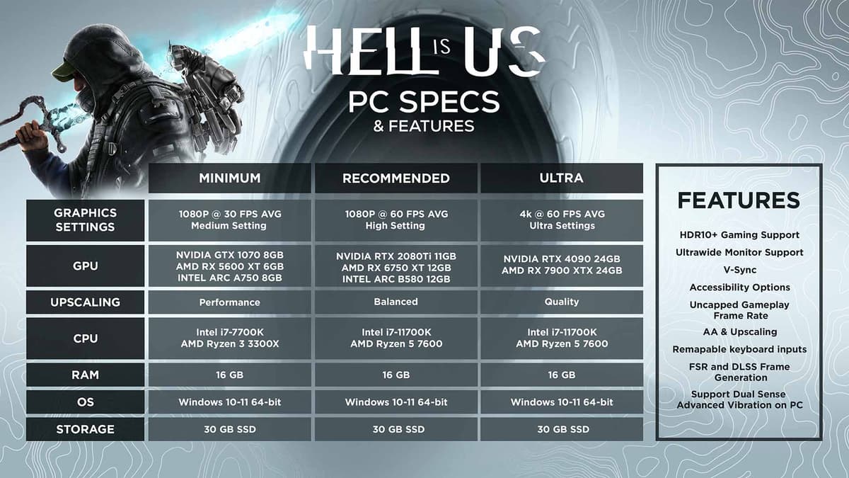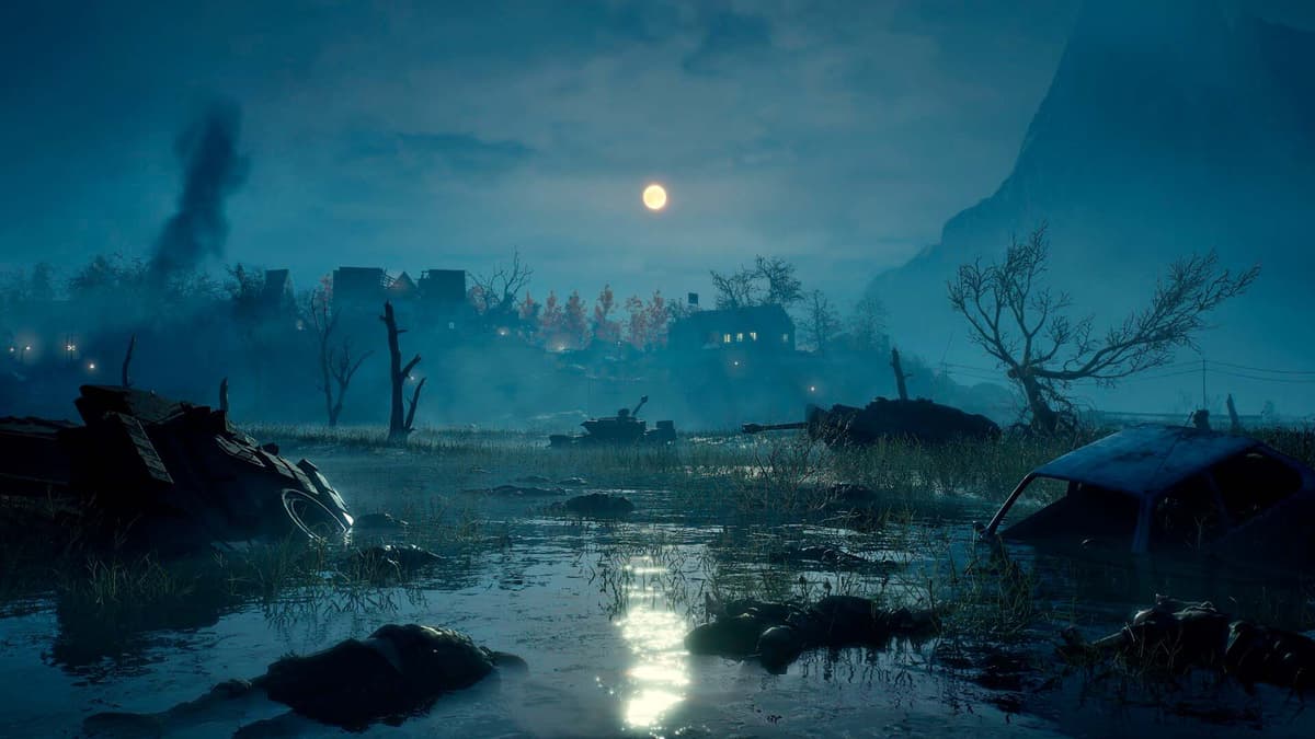 Hell is Us не пытается ослепить. Арт‐дирекшн минималистичен: серые поля, выжженные перелески, бетон с отслоившейся краской, тусклые плакаты на ржавых заборах. Когда появляется цвет — он значимый: красный платок на ветру, зелёная лампа под лестницей, хрупкий синий рассвет над линией фронта. Работа со светом подчинена навигации: нечастый луч в тёмном коридоре — не декор, а указатель без стрелок.
