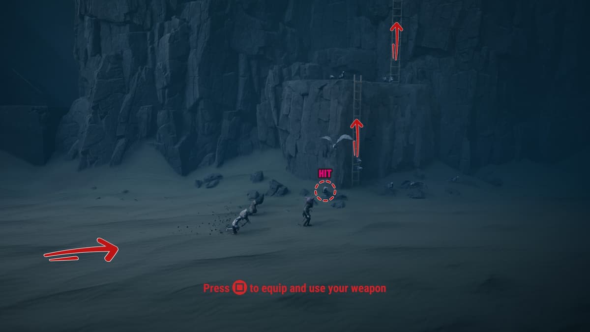 У лестницы будет стая чаек. Разберись с ними и лезь наверх, на утёс.