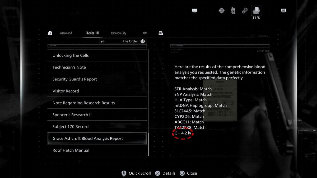 Дальше, в исследовательском центре под внутренним двором, перед лабораторией с ключом от вертолёта валяется файл «Отчёт об анализе крови Грэйс Эшкрофт».