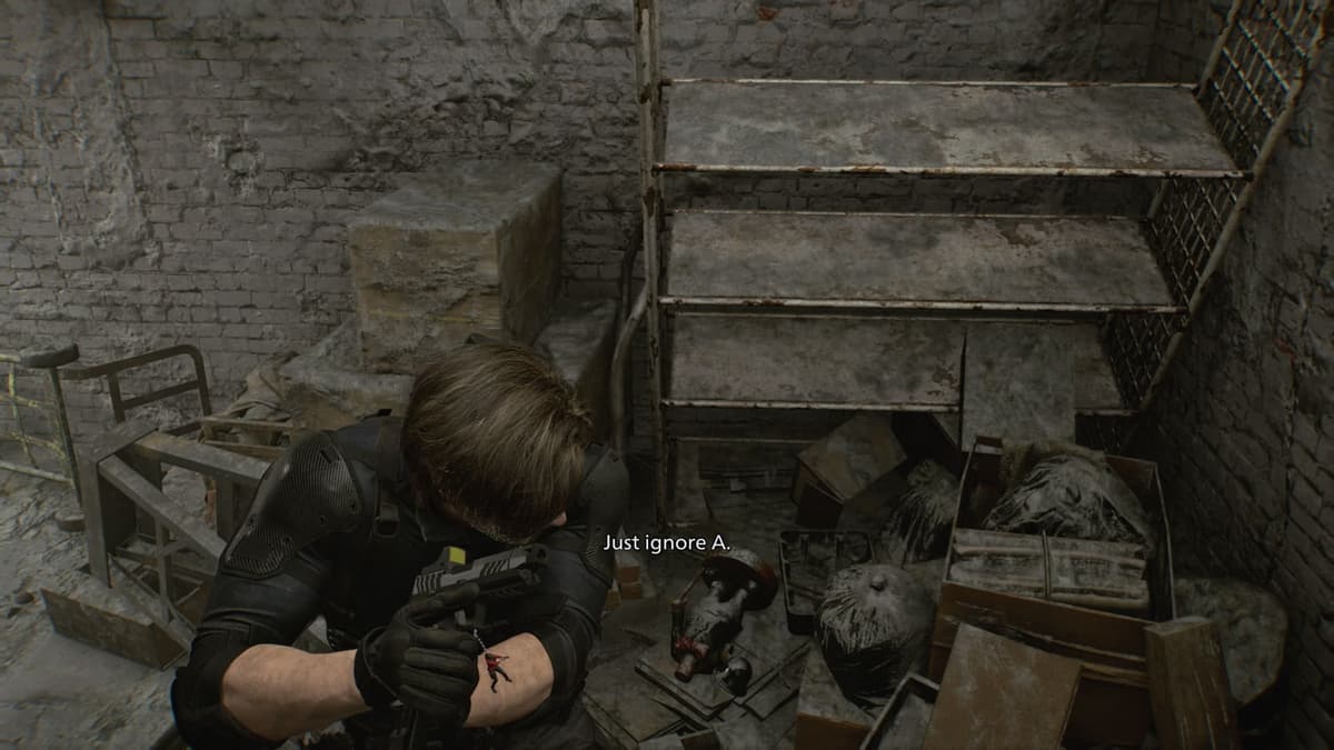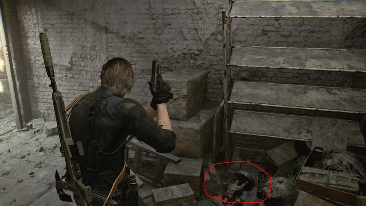 Ближе к концу игры, когда Леон пробирается через один знакомый магазинчик, в подсобке можно заметить туловище игрушечного болванчика. Но взять его нельзя.