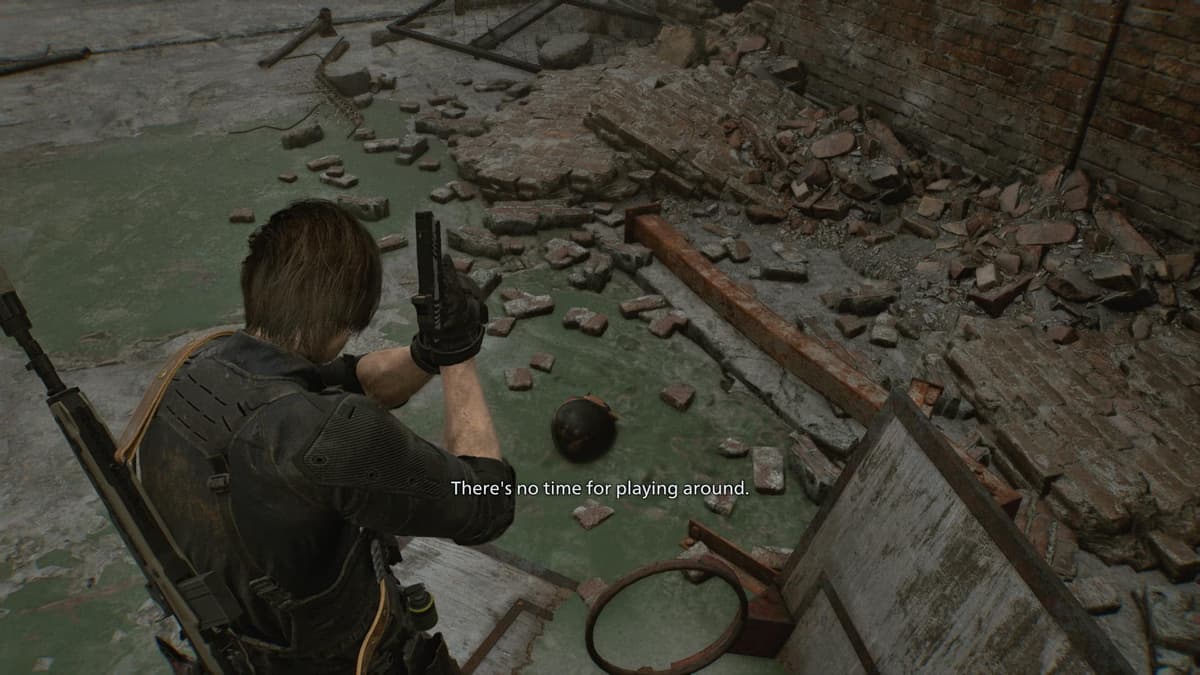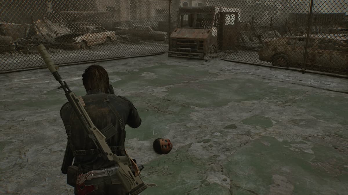 После босса, охраняющего путь к приюту, попадёшь на разрушенную баскетбольную площадку. Там в центре лежит голова этого же болванчика. Поднять её нельзя, но можно пинать.