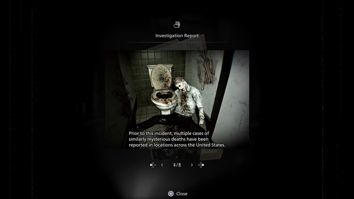 Но это ещё не всё. Нужно, чтобы кровь попала в Исследовательскую лабораторию под внутренним двором. Для этого придётся… смыть унитаз. В самом первом файле игры, в отчёте Грэйс, на 4 странице из 8 есть запись о трупе, найденном в туалете. На стене над телом видно размытое число «8».
