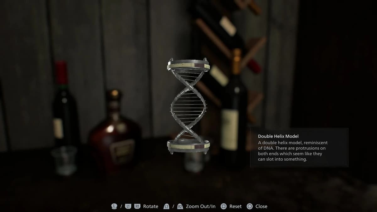 В том же зале на баре стоит бутылка вина «Sanguis Virginus». Присмотрись — этикетка криво наклеена. Покрути её, пока не встанет ровно: бутылка откроется — внутри модель.