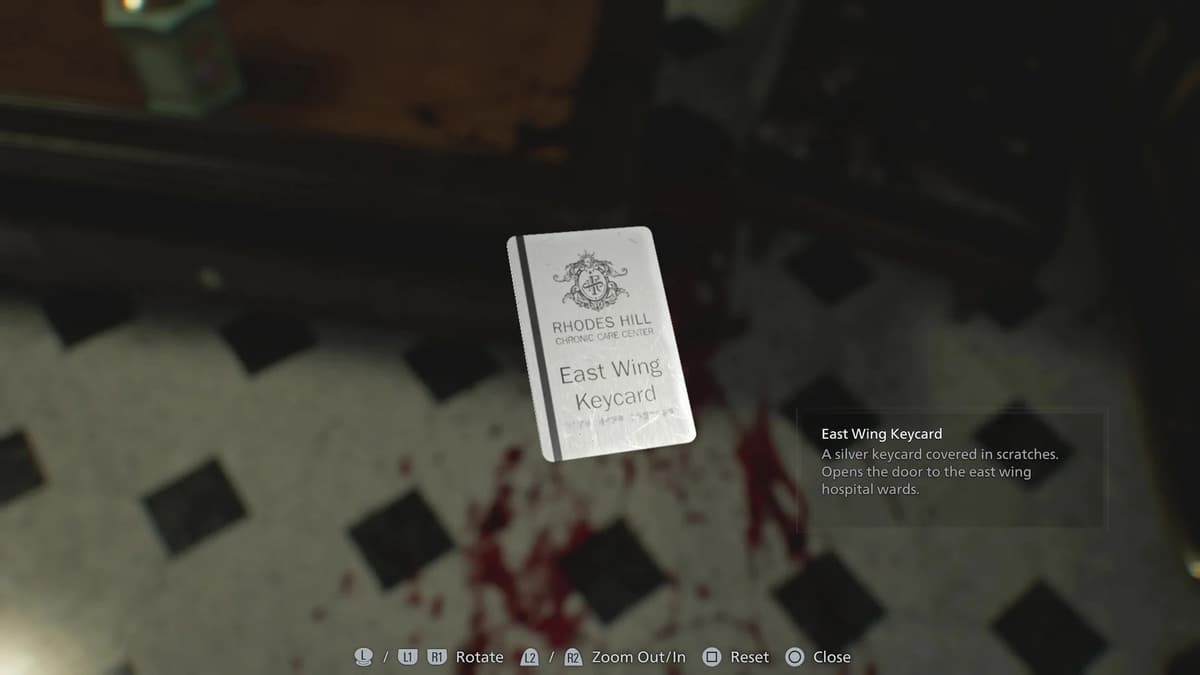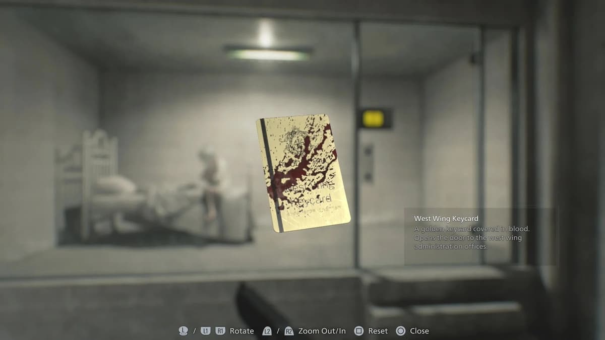 В Холле зайди в Комнату охраны, а оттуда — в Комнату с медикаментами. Там будет кат-сцена, и Грэйс сама подберёт карточку.
