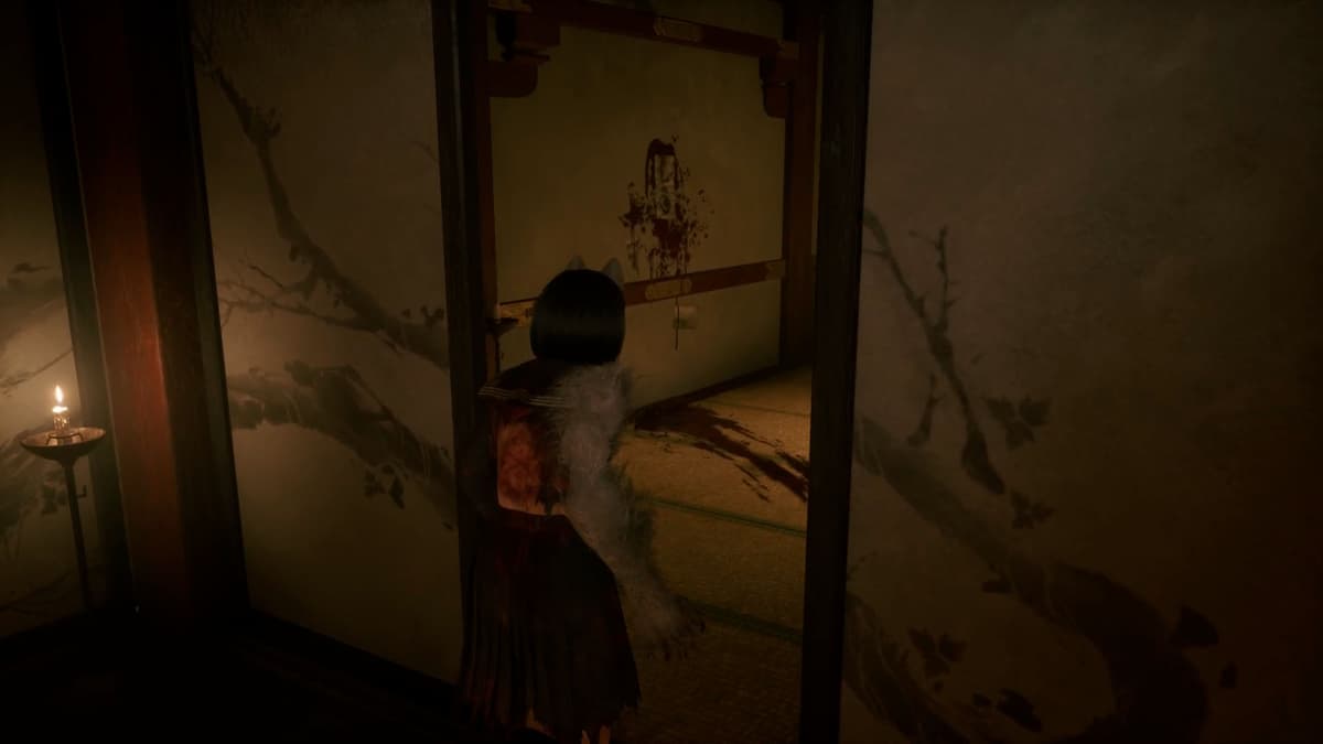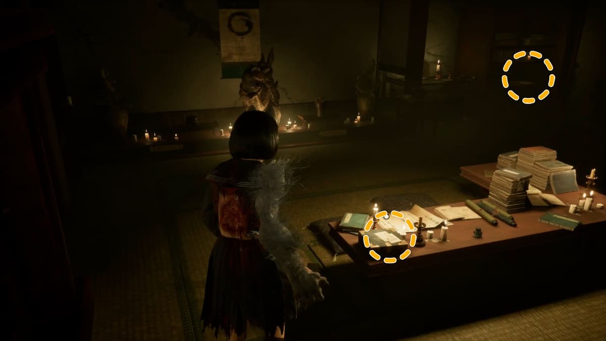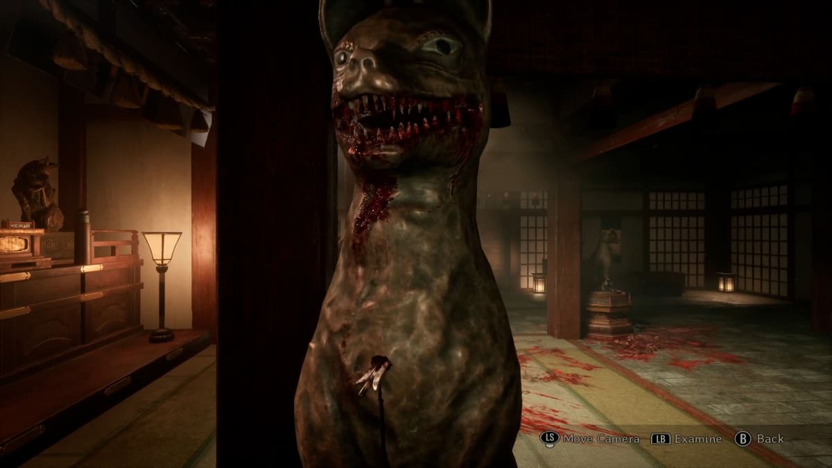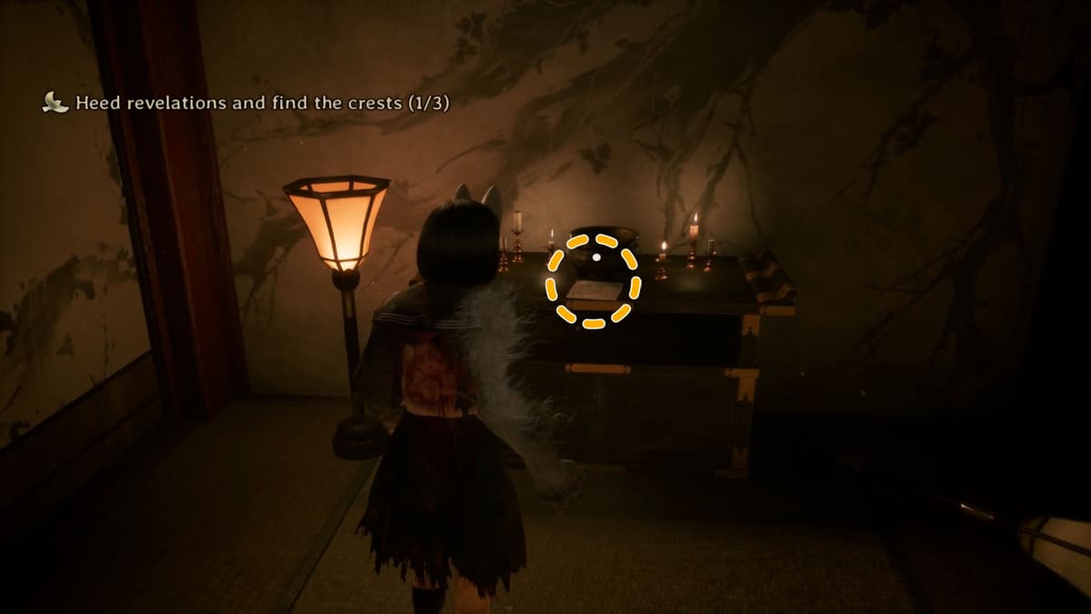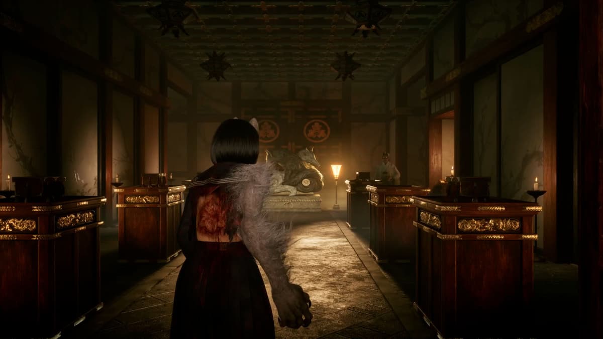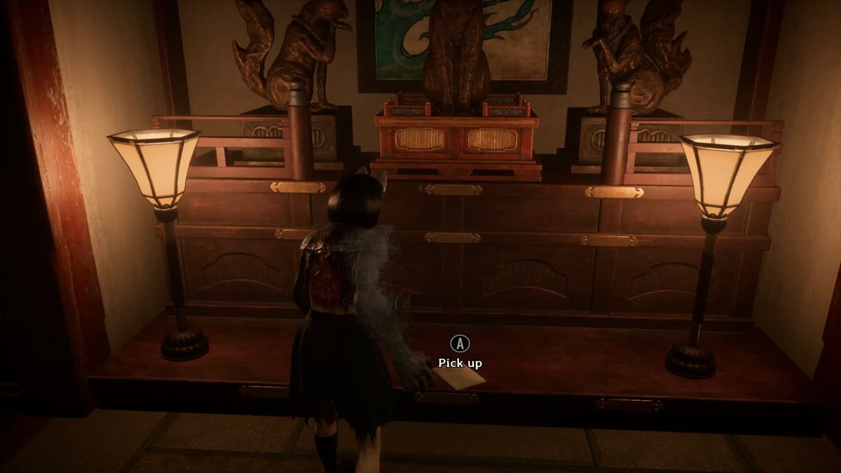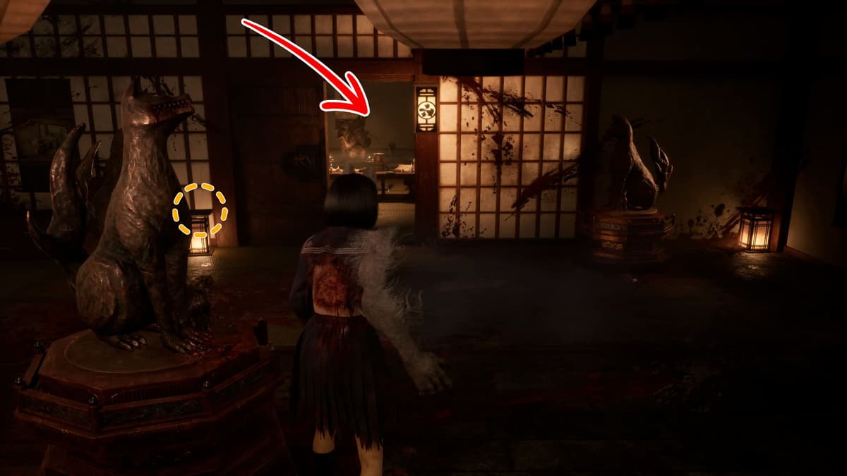 У третьей справа колонны, в статуе — Инари суши. Слева у второй статуи рядом с гобеленом с лисами — Божественная вода. Теперь подойди к статуе чуть правее третьей слева, опусти камеру к бедру, вытащи стрелу — получишь Богато украшенный свиток. Взгляд статуи укажет нужную дверь — вторая слева от входа.
