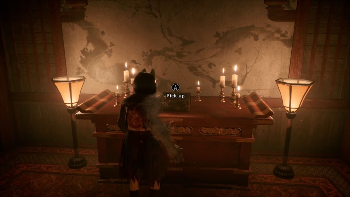 Зайди в комнату слева от алтаря и подбери записку горничной. Затем вернись к алтарю и открой короб — там Герб Чёрного Воробья.