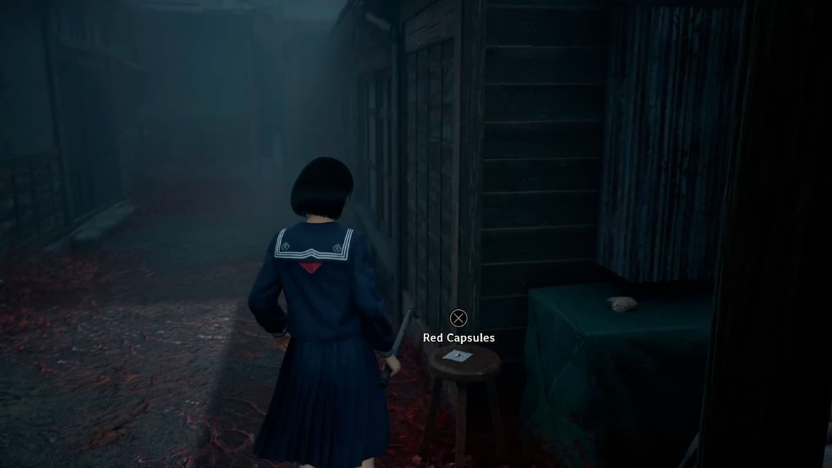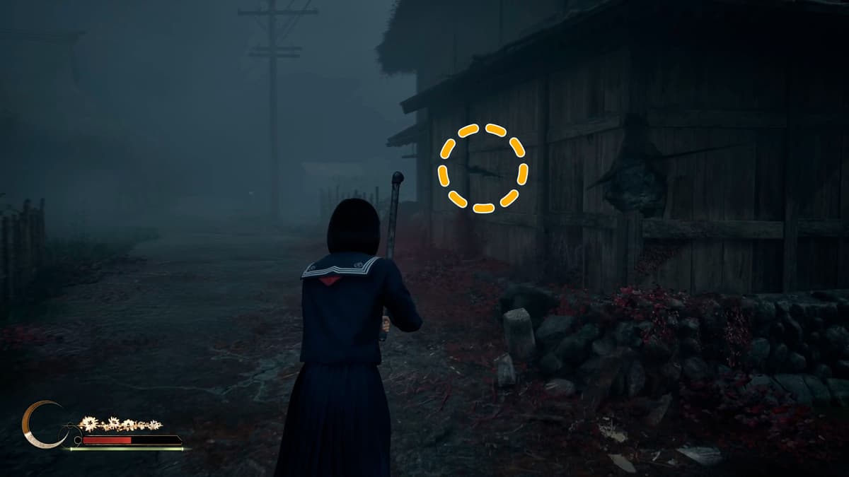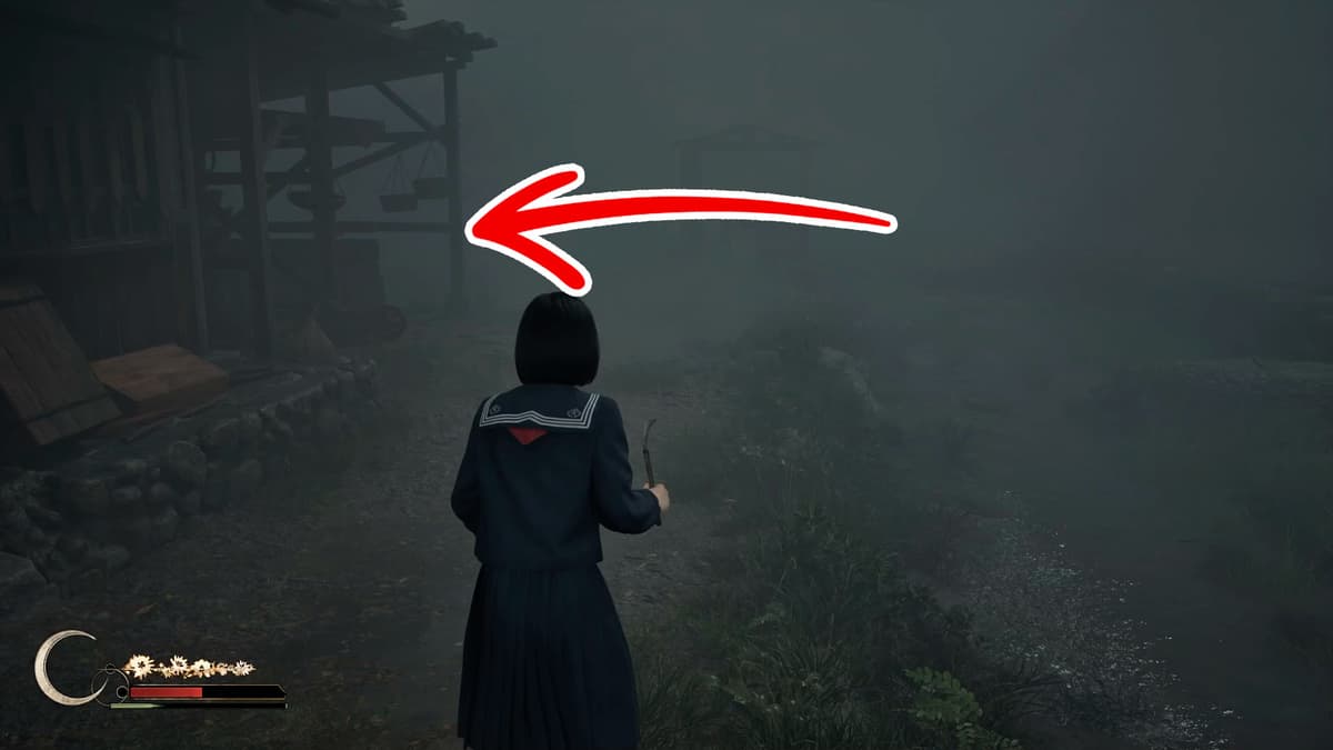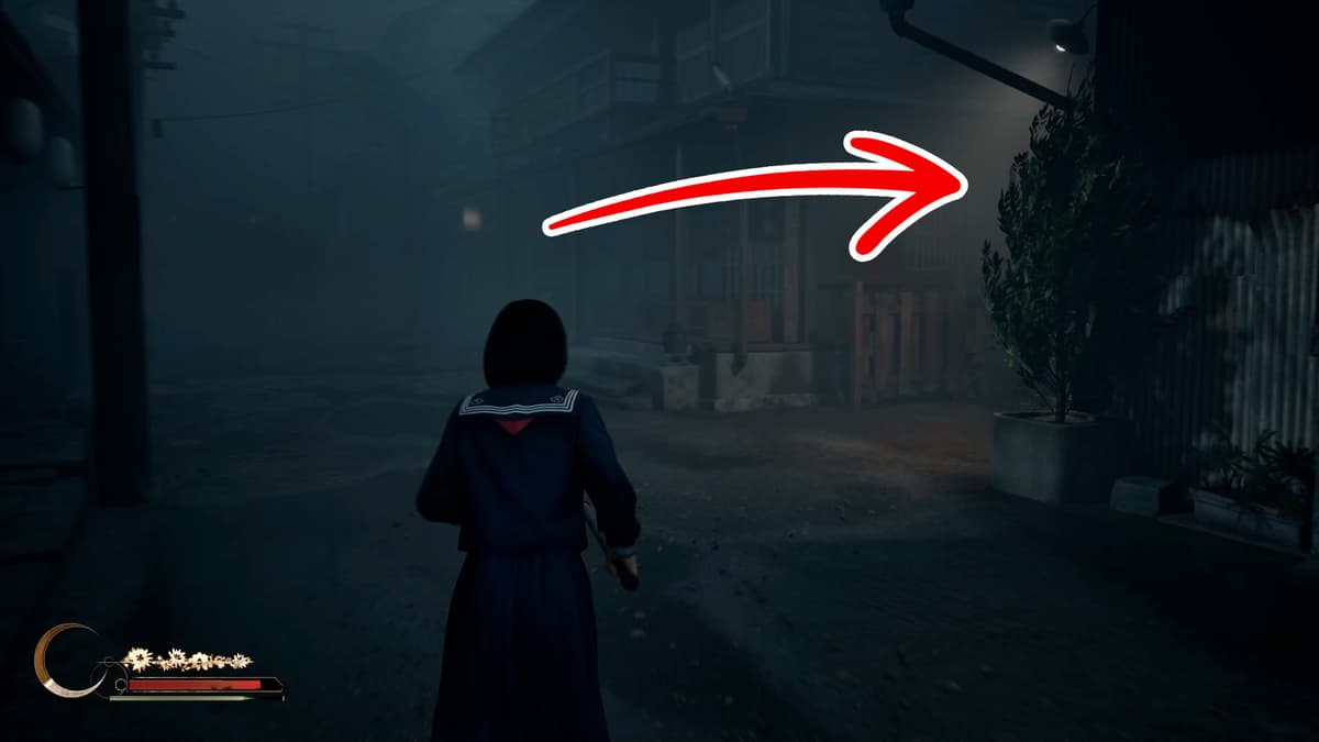 Сверни на стройку: в коробке лежит стальная труба, рядом в ящике — чай из кудзу (этот айтем восстанавливает здоровье и рассудок Хинако). У лестницы в соседнем ящике — арарэ (восстанавливает небольшое количество здоровья). Вернись на тропу, у синего грузовика в ящике лежит бинт. Чуть дальше, когда дойдёшь до красной жижи под ногами, обрати внимание на трещину в стене — это отметка, что с ней можно взаимодействовать.