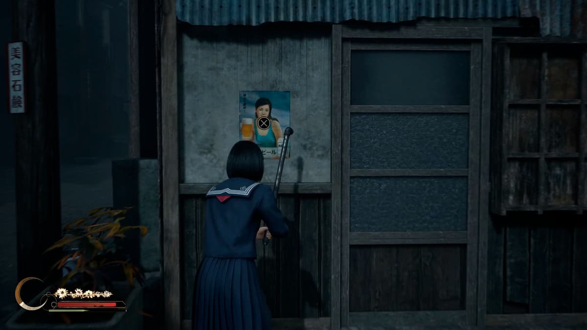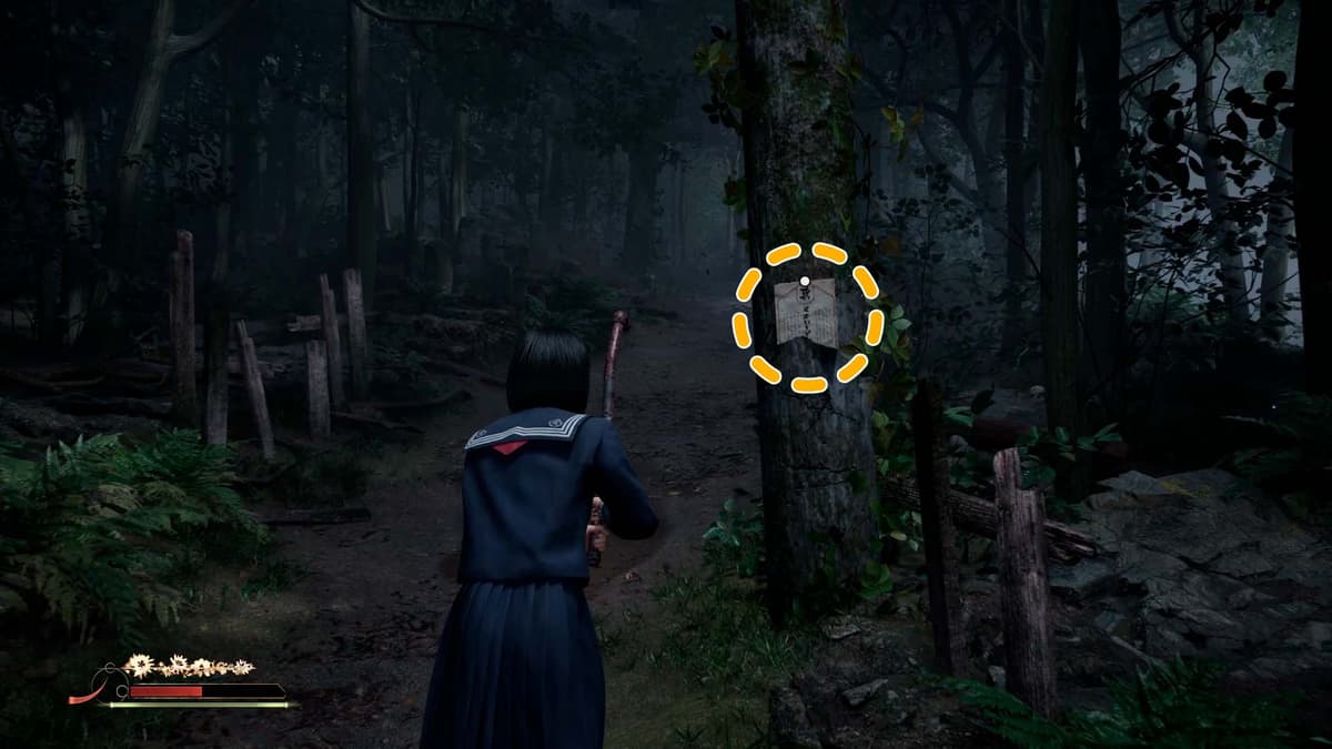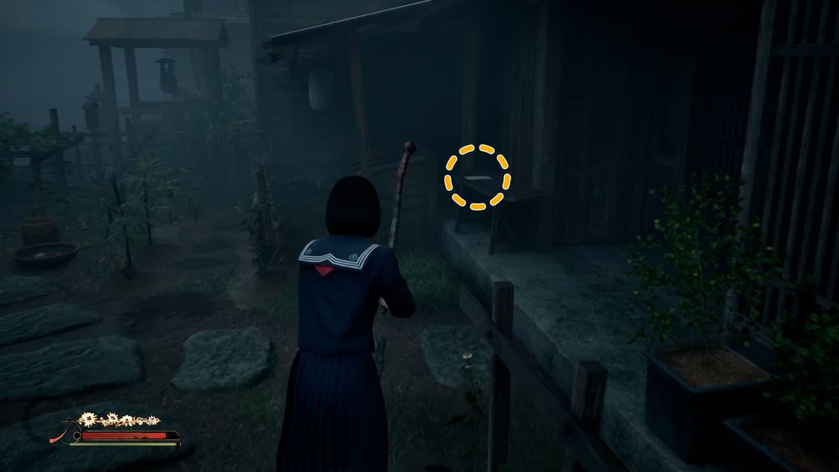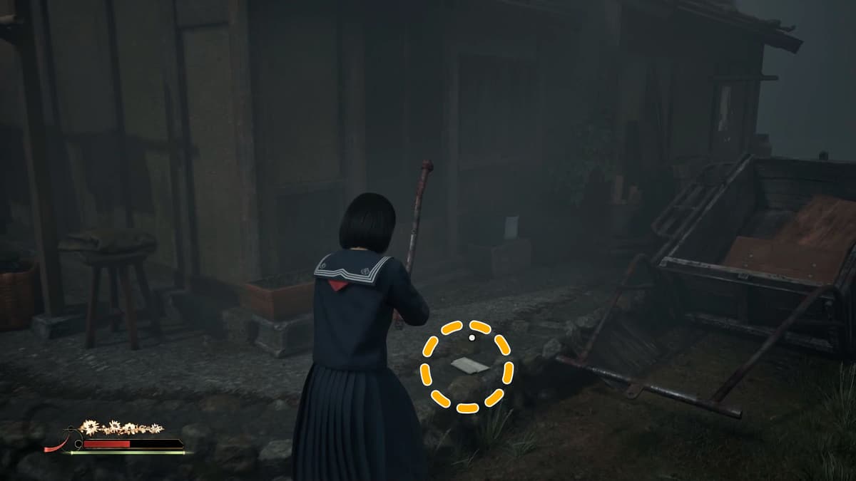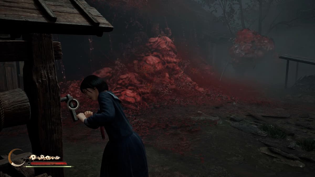 Сверни на стройку: в коробке лежит стальная труба, рядом в ящике — чай из кудзу (этот айтем восстанавливает здоровье и рассудок Хинако). У лестницы в соседнем ящике — арарэ (восстанавливает небольшое количество здоровья). Вернись на тропу, у синего грузовика в ящике лежит бинт. Чуть дальше, когда дойдёшь до красной жижи под ногами, обрати внимание на трещину в стене — это отметка, что с ней можно взаимодействовать.