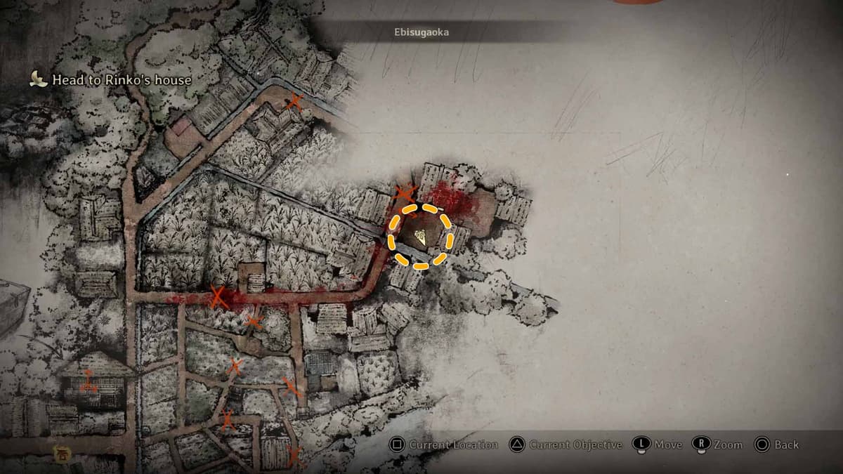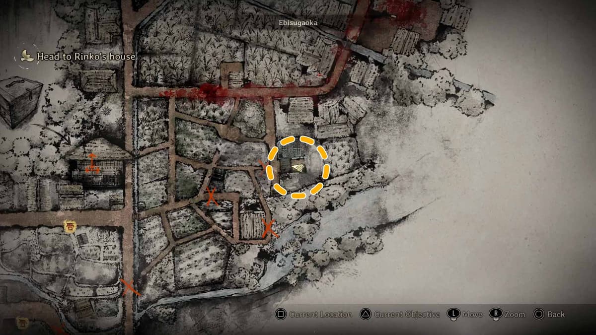 По дорожке продолжай идти на север к следующему дому: у мешков в коробке — бинт, за домом в корзине — арарэ. Дальше тропа уводит к северной кромке — тут начнётся зона святилища Сакуко.