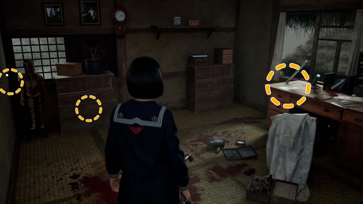 В соседнем кабинете (дверь теперь приоткрыта) на стене увидишь отметины когтей, на столе — «Отчёт о вскрытии: причина смерти не установлена», а в тумбе рядом с манекеном с располовиненным мозгом — омамори Сосна. Амулет ощутимо спасает от «случайной смерти» в узком коридоре — лучше надень его сразу.