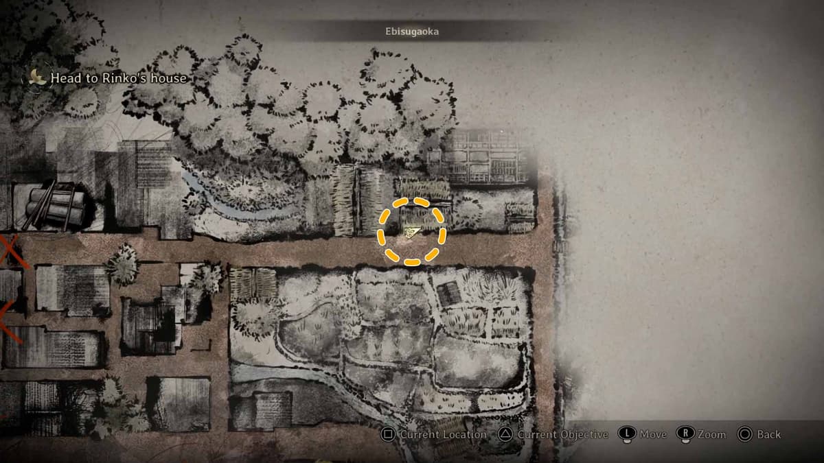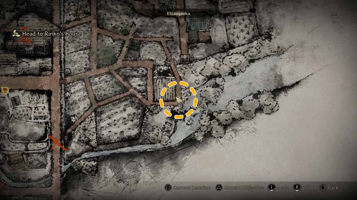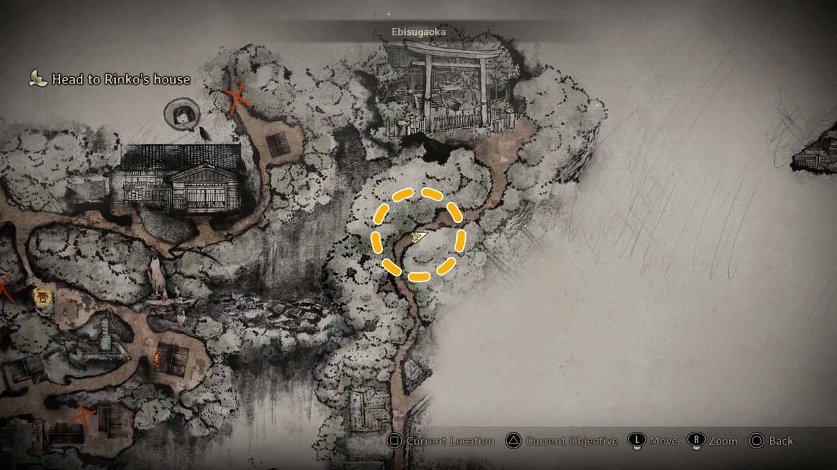 За стеной справа — сад: в коробке ещё один хигаши. Далее иди на восток — туман будет сгущаться, но вскоре справа будет Хокора. Напротив, за низким соломенным заграждением, лежит эма (деревянная табличка для желаний).