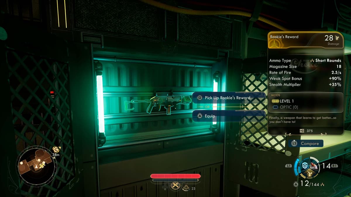 Забирай награду (SMG). Уникалка растёт с тобой: повышается урон, магазин, темп огня и контролируемость, если активно ей пользуешься. Для старта — замечательно. У пистолета‑пулемёта два слота под моды: на ранних этапах хорошо садятся расширенный магазин и любой стабилизатор/компенсатор — меньше отдача, больше аптайм по голове. Ремонтируй пушку у верстака, а дубликаты разбирай — качество на автоматах уходит быстрее, чем кажется.