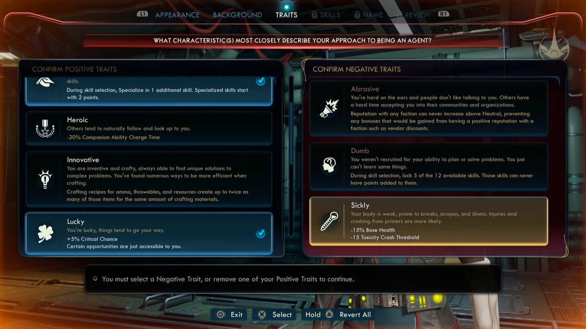 Если берёшь оба, игра предложит забрать один негативный трейт. Самый «приятный» — Болезненный: −15% к базовому здоровью и −15 к порогу токсического урона. В начале это ощутимо, но минус нивелируется экипировкой и уровнем, тогда как альтернативные «негативы» сложнее обойти.