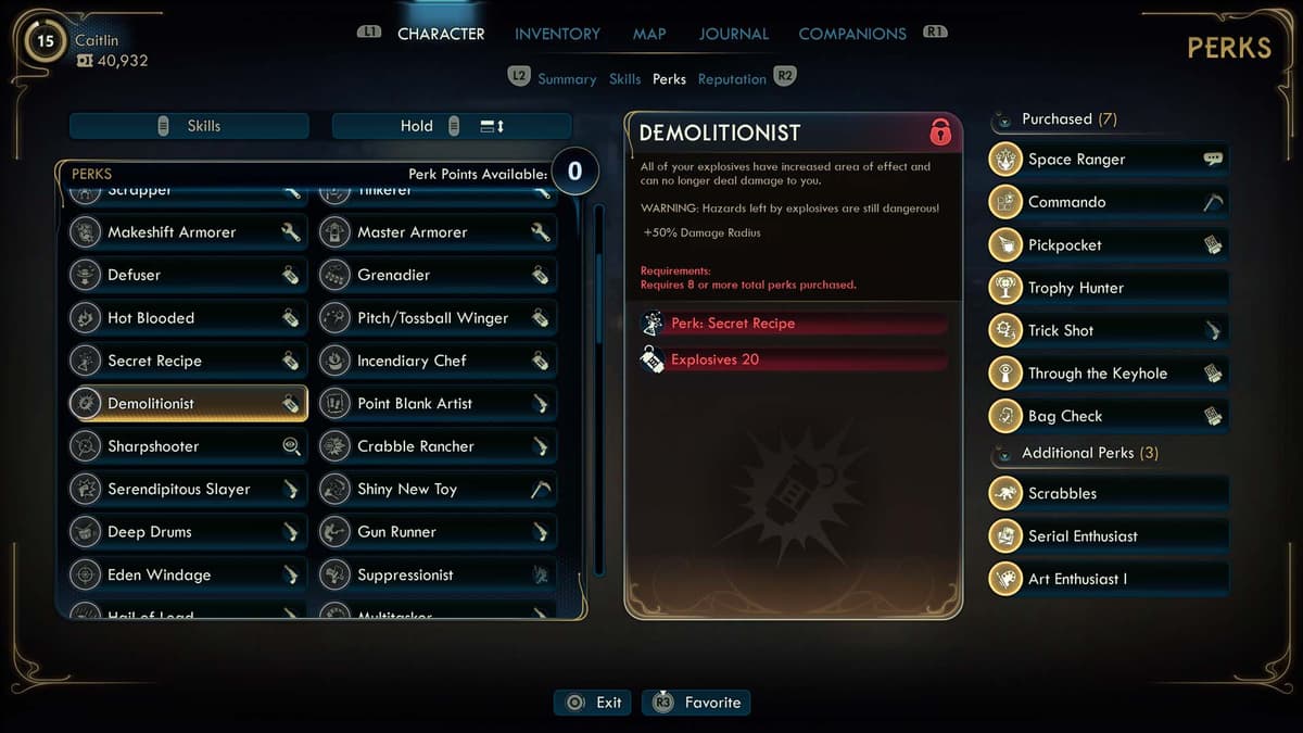 Загляни во вкладку Персонаж → Перки. Важно то, что весь список перков виден заранее. Пролистай, оцени эффекты и добавь избранные — тогда начнёшь качаться осознанно, понимая, какие навыки необходимы для нужной связки.