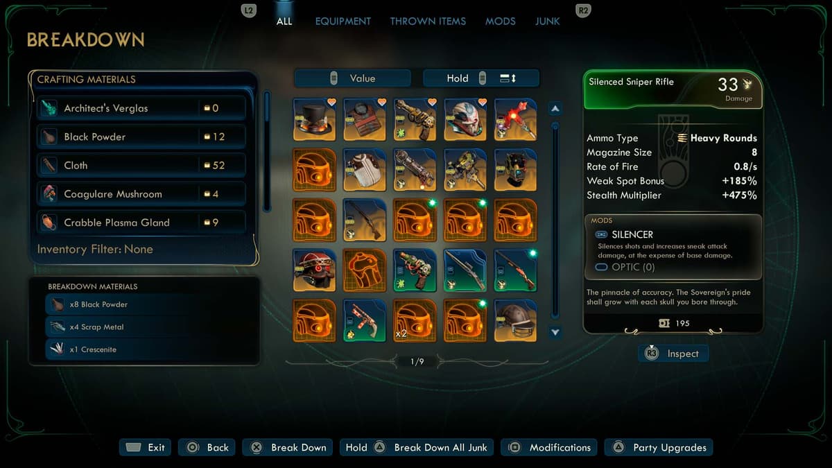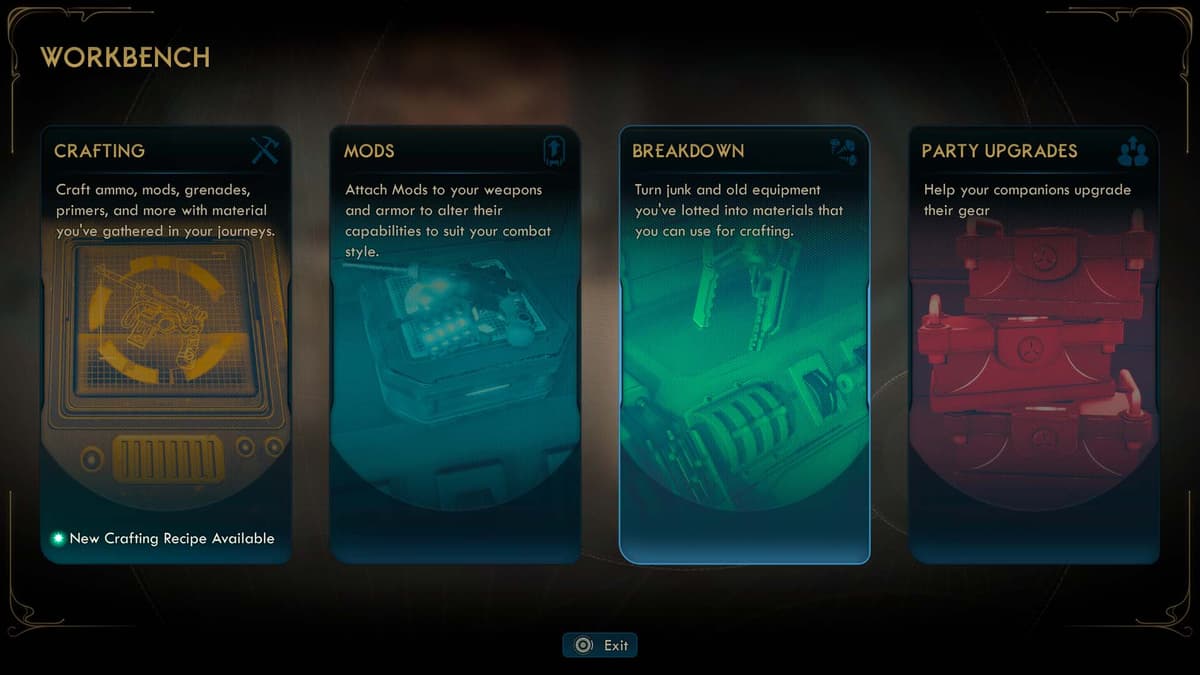 Подходи к верстаку (один стоит на борту «Инкогнито») или пользуйся опцией «Полевой мастер» у Найлса и разбирай ненужное — получишь крафтовые материалы. Из них потом соберёшь то, что действительно нужно, если есть рецепт. Это и порядок в рюкзаке, и реальная польза в бою.