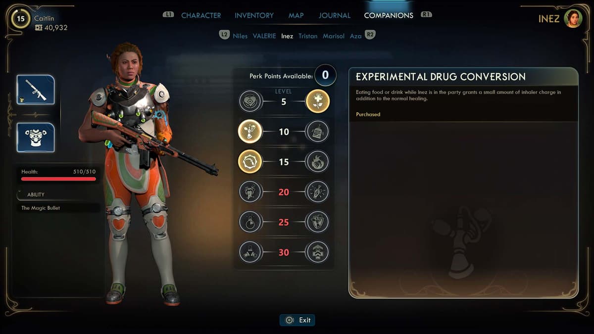 Лайфхак: если в активной группе Инес и ты достиг 10 уровня, возьми ей перк «Экспериментальное преобразование лекарств» (Experimental Drug Conversion).