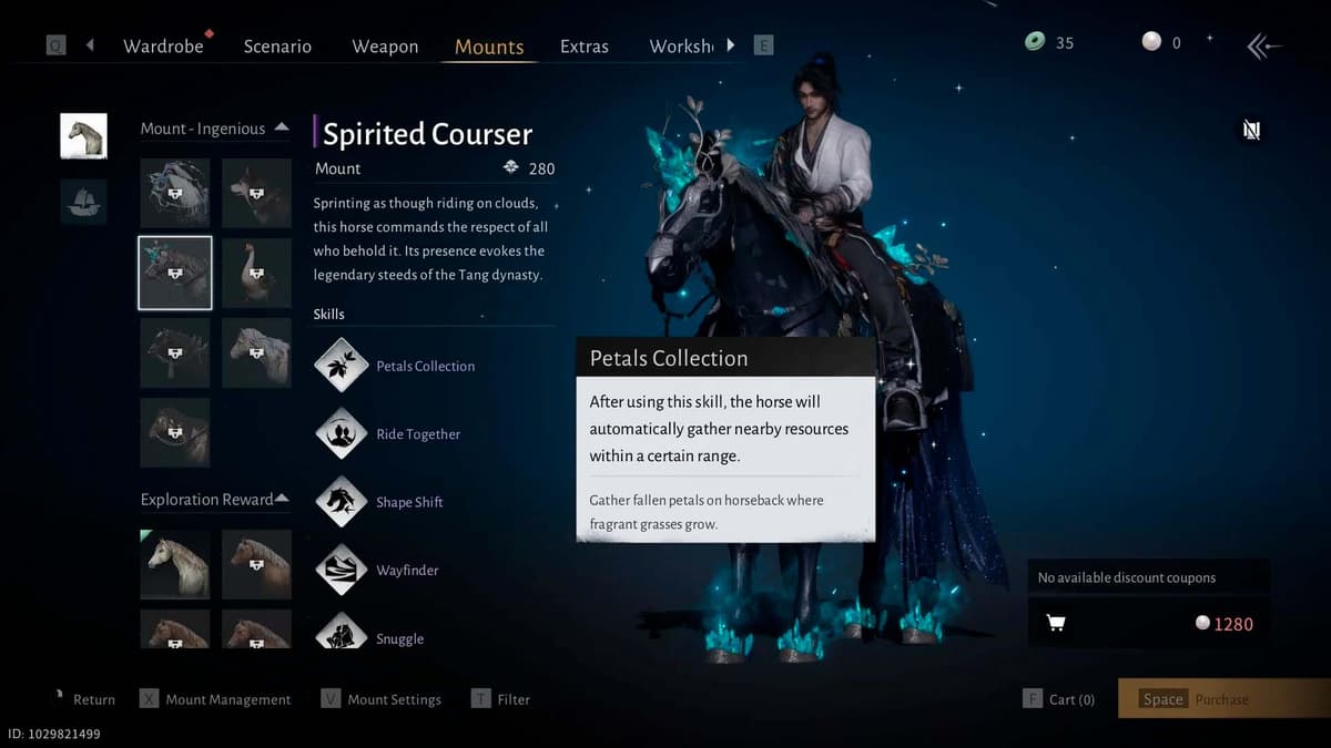 Если одной лошади мало — новых маунтов можно добывать разными способами. Открой меню Appearance и загляни во вкладку Mount. Здесь показаны все доступные ездовое животные, разделённые на две категории: Ingenious и Exploration Rewards.
