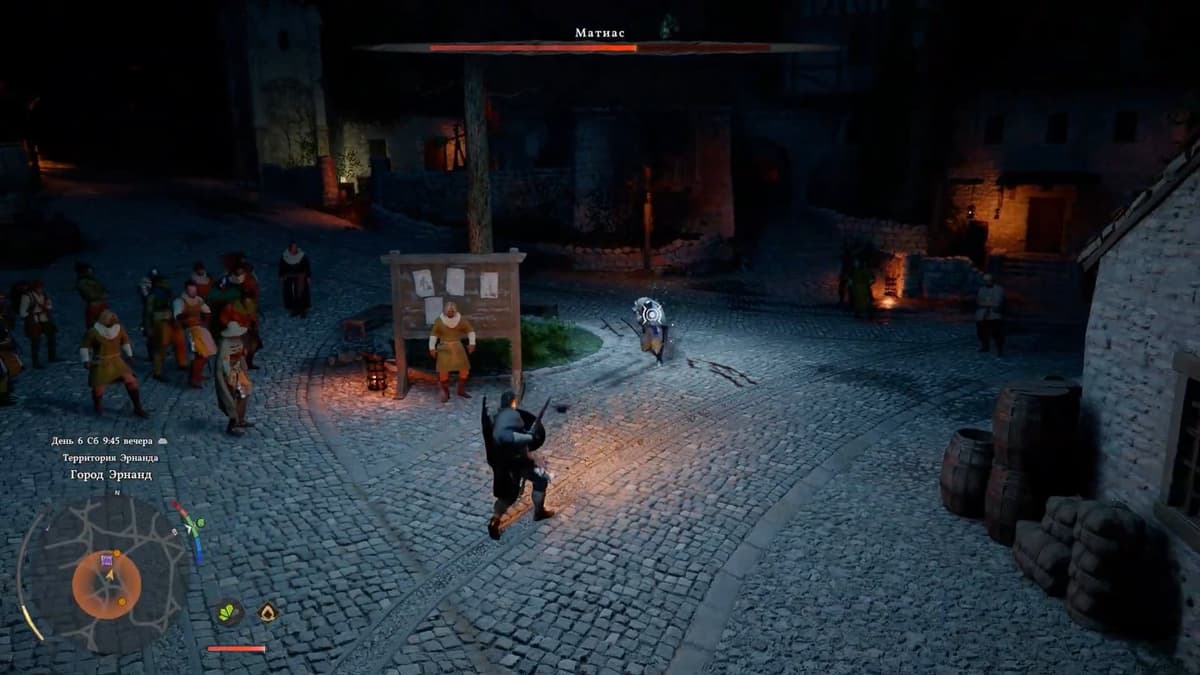 Но как только видишь, что рыцарь заносит ногу для удара — уходи в сторону кувырком или просто отойди. Пинок игнорирует блоки. Если не увернёшься, персонаж рухнет на землю, а Матиас продолжит тебя атаковать.