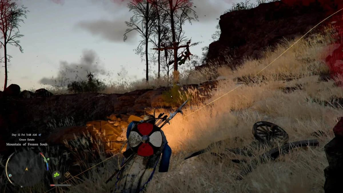 Добрался до вершины? Видишь палатку слева? Ни в коем случае не проходи мимо. Там ящик с припасами. Забирай всё и готовь столько еды, сколько влезет в инвентарь. И не забудь про точильный камень — маленький бафф для оружия лишним не будет.