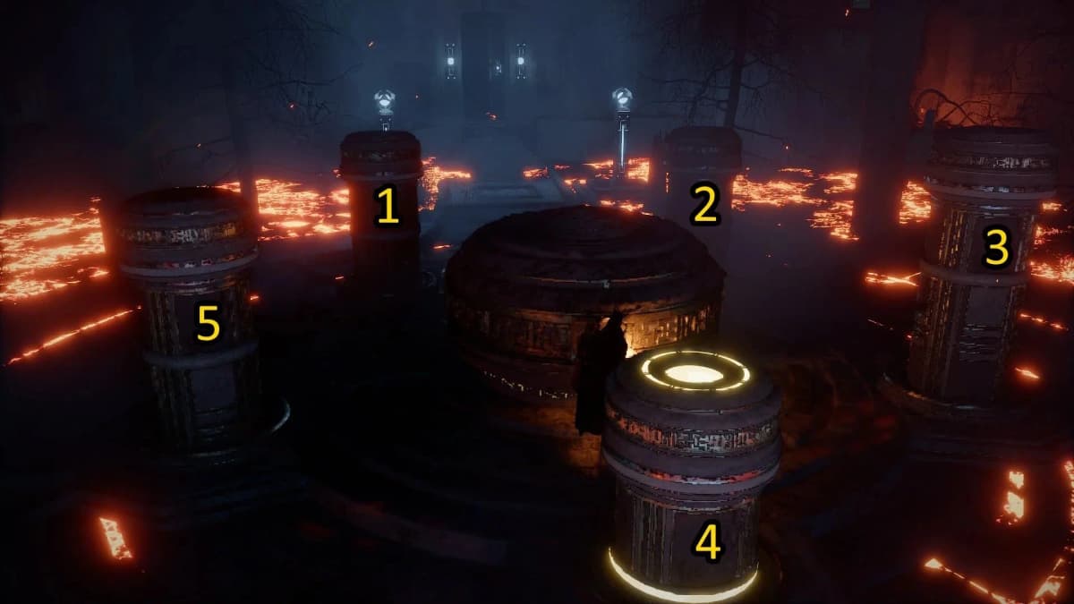 В первую очередь подойди к короткому столбу (на скриншоте выше он под номером 4). Воткни в него меч (с помощью способности Укол) и поверни налево полтора оборота (один длинный и один короткий).