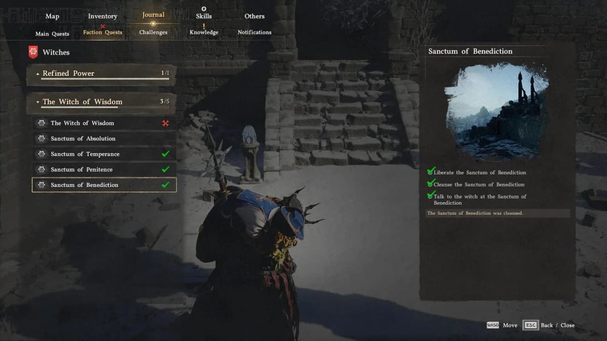 Придётся добраться до квеста «Ведьма мудрости» фракции Ведьм. Эловен расскажет о четырёх святилищах и попросит их очистить.