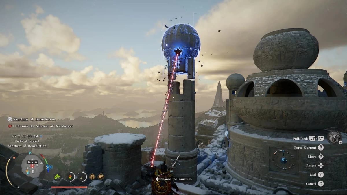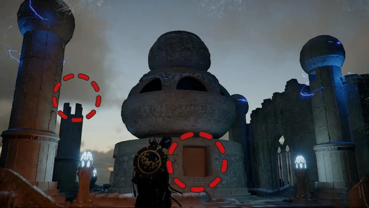Для начала, нужно найти и установить два блока в древнюю машину в центре руин. Один блок отсутствует в одной из четырёх колонн вокруг механизма, а второй нужно вставить в центральную печь.