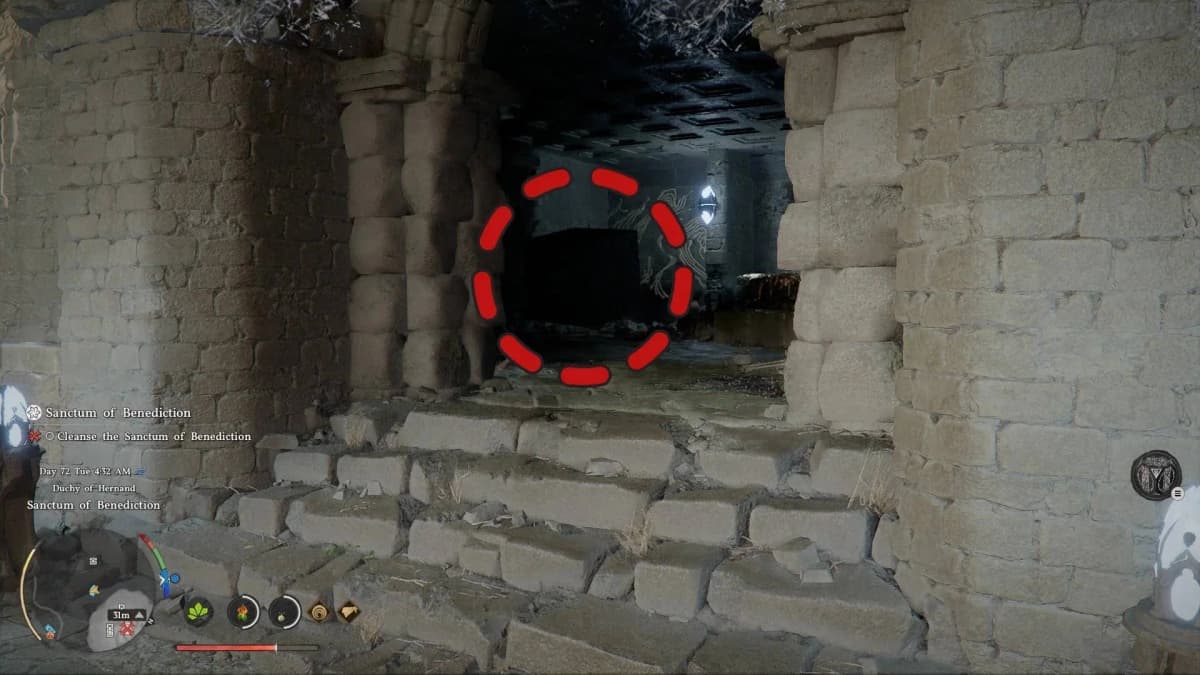 Святилище находится западнее города Эрнанд, вдоль реки, которая тянется до самого края карты. Оно высоко в горах, так что прихвати снаряжение с защитой от холода. Например, Тканевый плащ Порорина даёт +3 к ледяной защите. И пару чашек Медового чая не забудь. Они помогут выжить в битве за освобождение святилища.