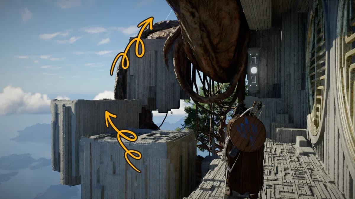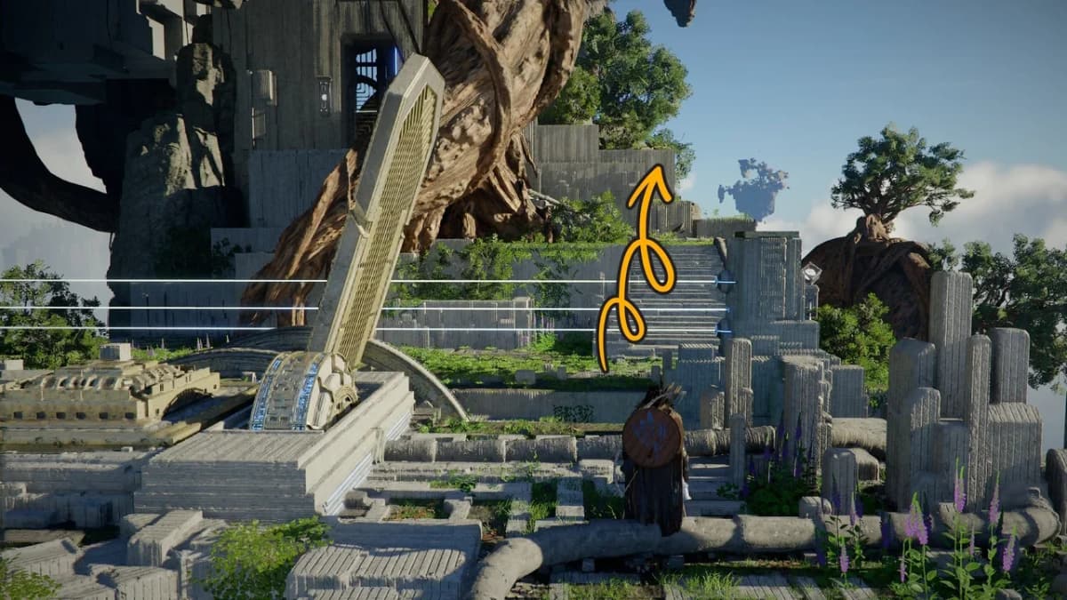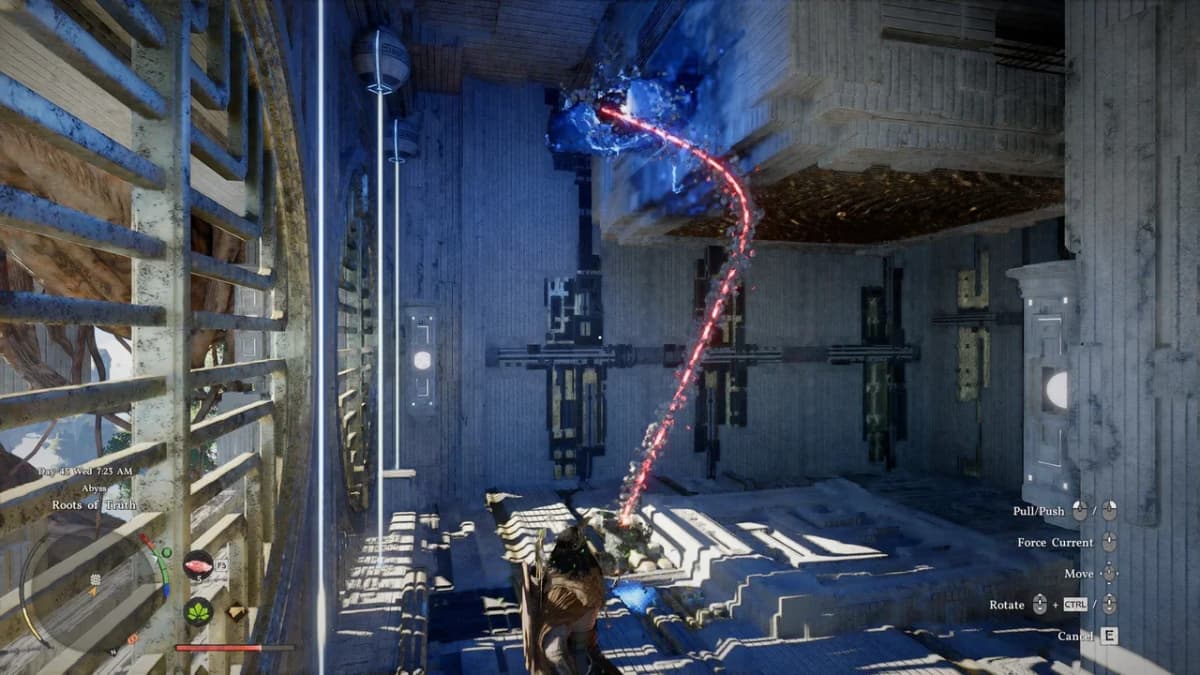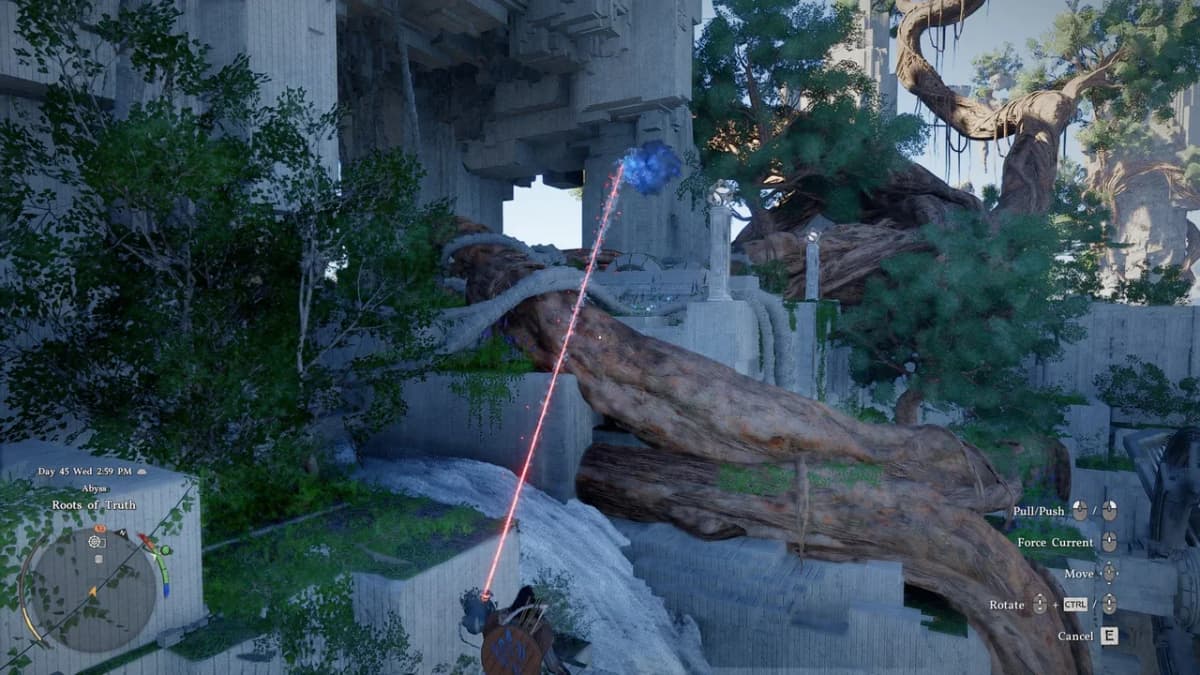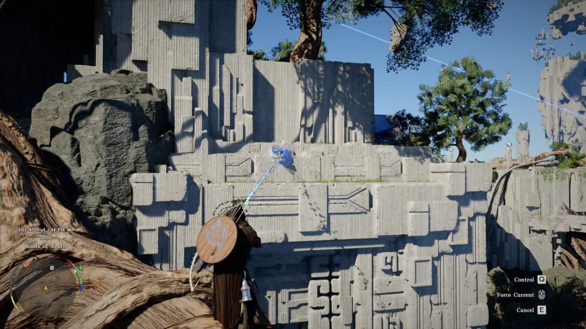 Заберись сверху на панель и активируй её с помощью Силы Аксиомы, а затем подойди к столбу со сферой и перелети к корням на юго-западе.