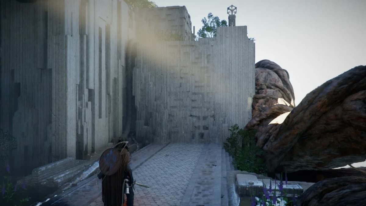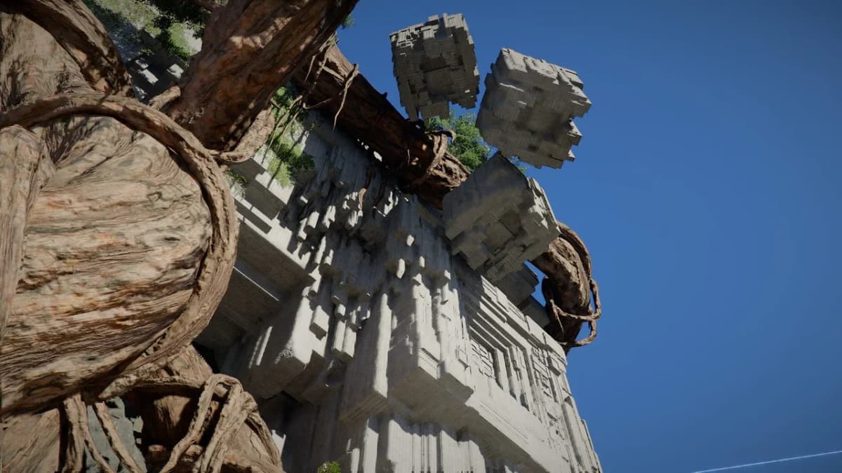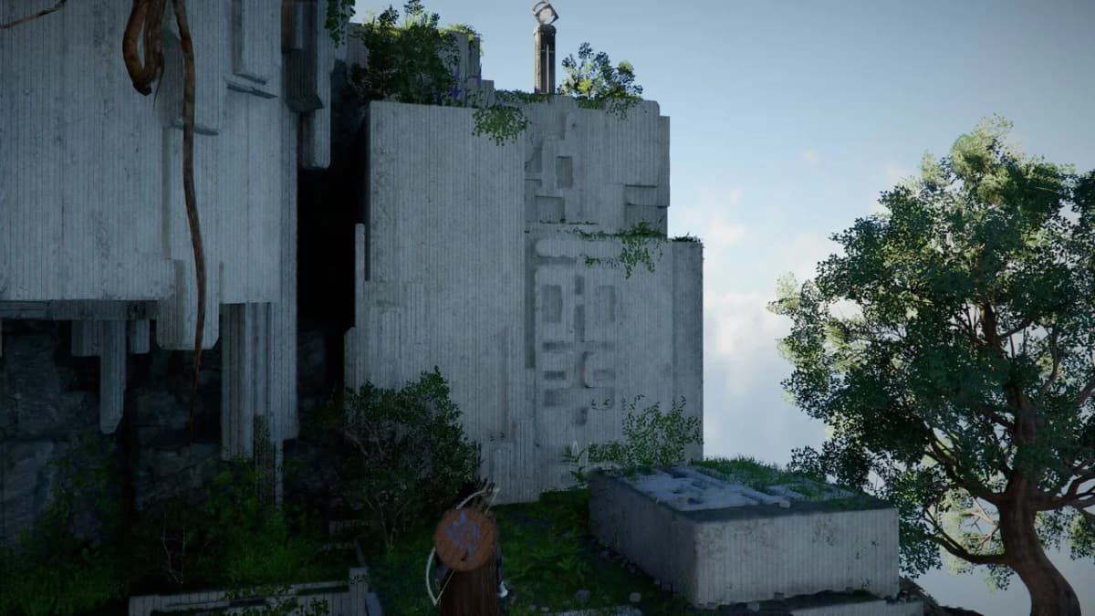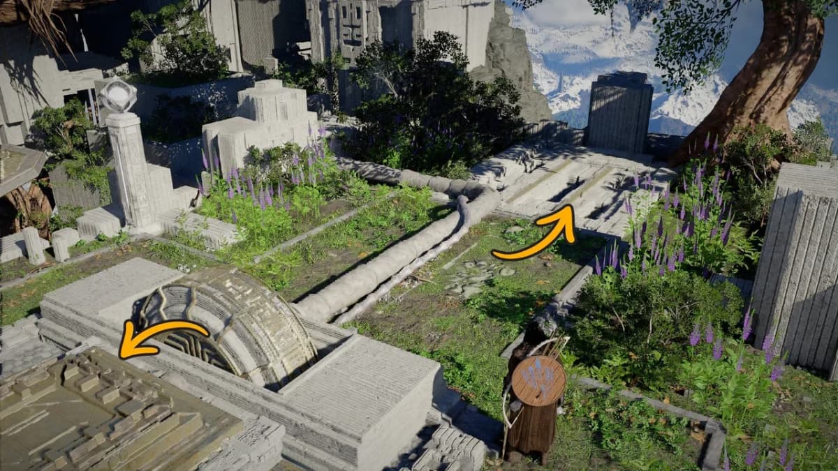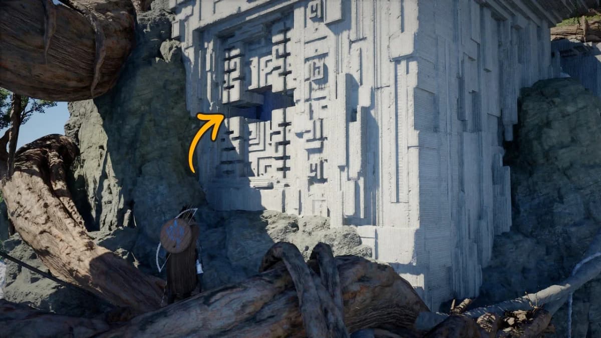 Заберись сверху на панель и активируй её с помощью Силы Аксиомы, а затем подойди к столбу со сферой и перелети к корням на юго-западе.