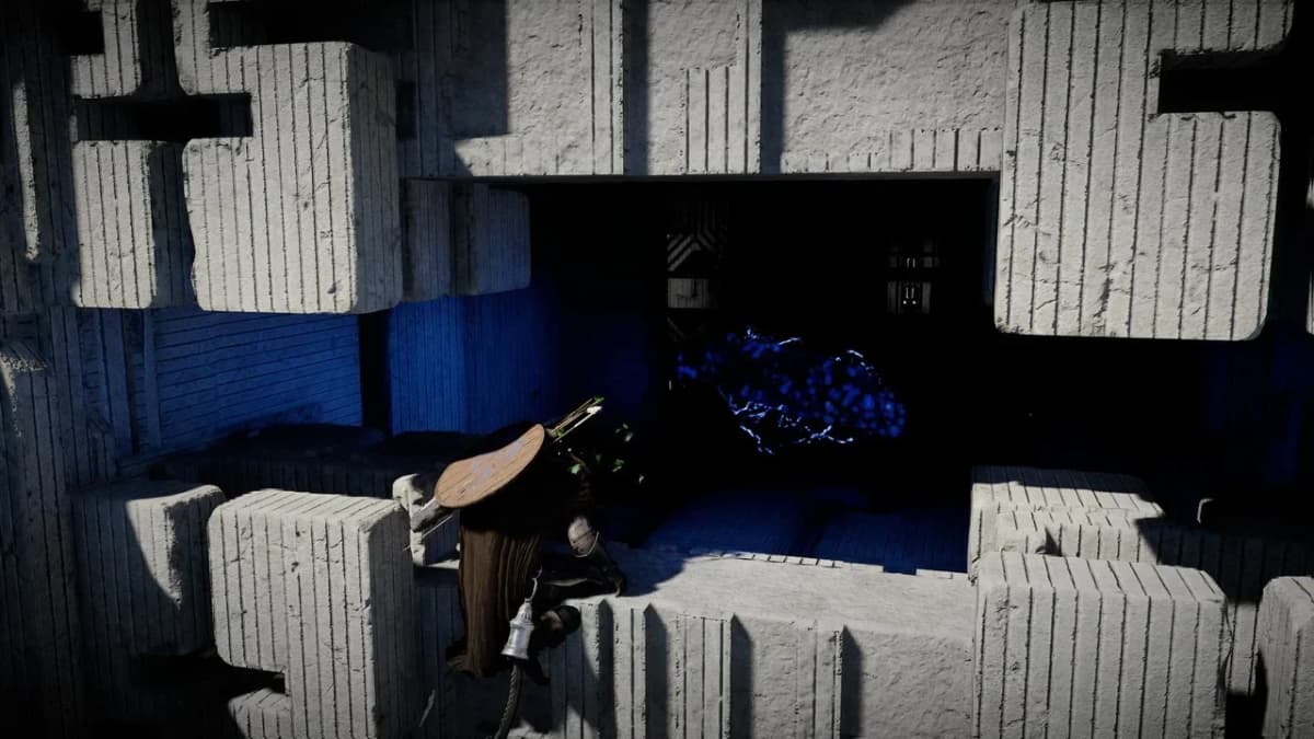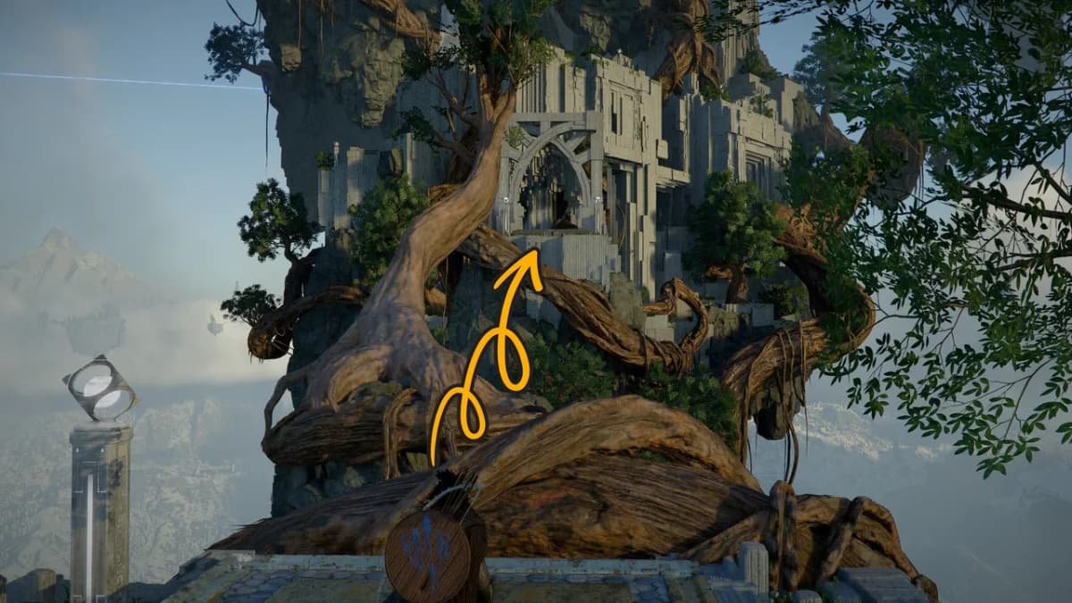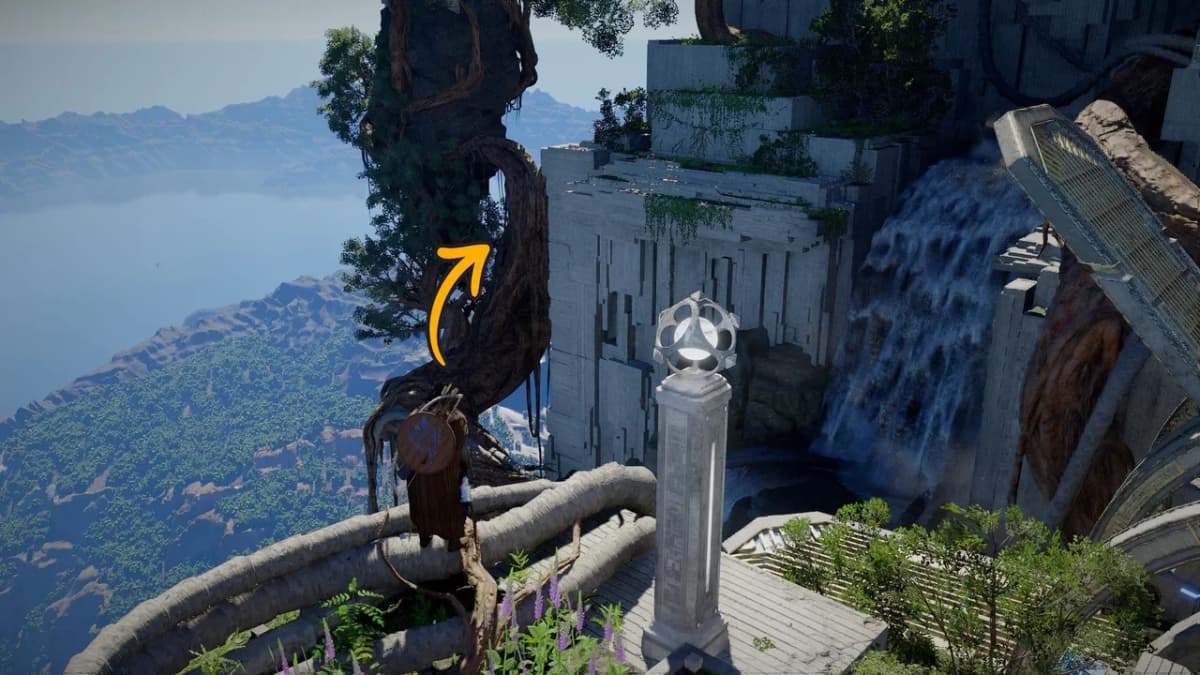 Залезай наверх по корням на севере, чтобы добраться до круглого девайса на стене. Активируй его, а затем поднимись выше и забери артефакт Бездны.