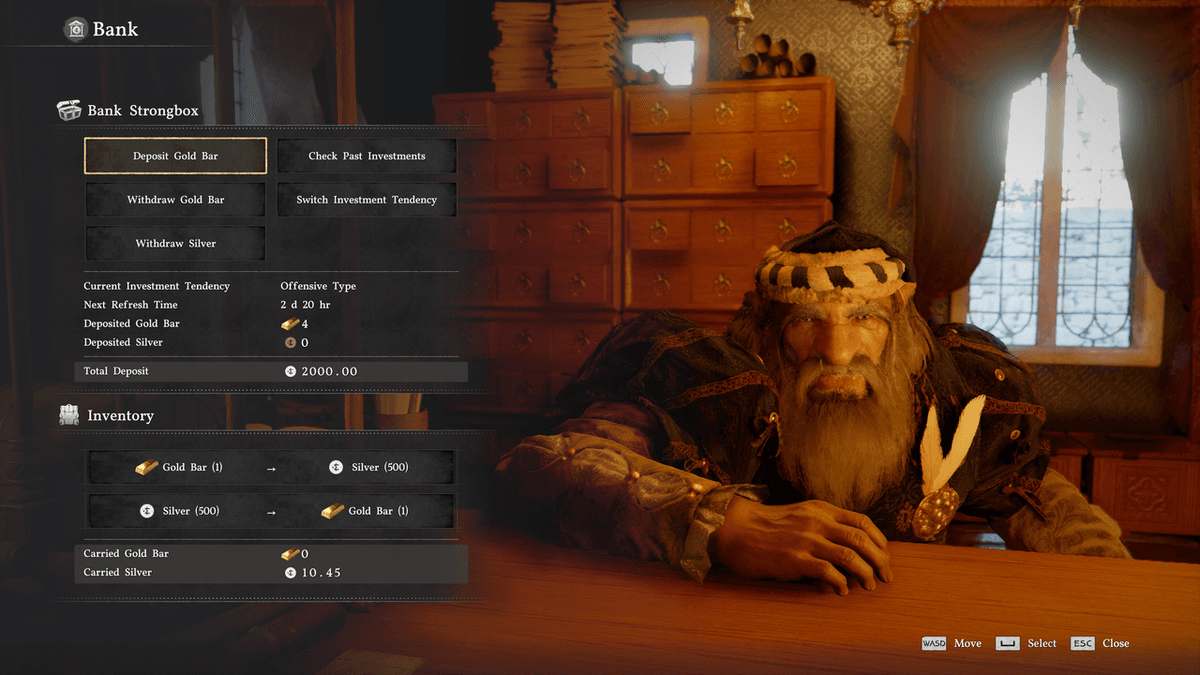 Все инвестиции в игре осуществляются через банк — его можно найти в северной части Эрнанда. Там тебе необходимо приобрести ячейку. Для этого заплати банкиру 100 единиц серебра, а затем закупи золотые слитки на 500 единиц, чтобы начать инвестировать.