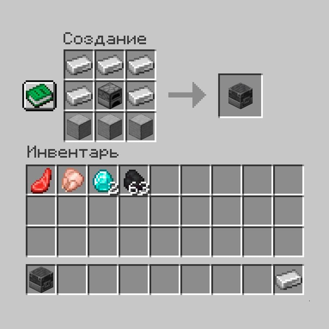 Плавильная печь — это блок, который переплавляет руды и металлические предметы в 2 раза быстрее, чем обычная печь. В русской версии — так и называется. В разговоре часто звучит «домна». Важно понимать ограничения: еда и неметаллы (песок → стекло, камень → каменные блоки и так далее) не принимаются. Для еды существует коптильня, для «всего остального» — базовая печь.