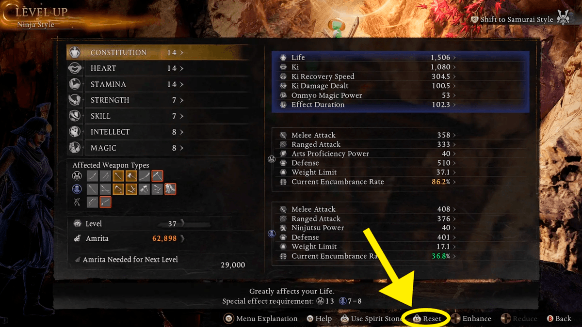 В Nioh 3, как и в предыдущих частях, очень большую роль играет твой билд. Если сборка тебе не по нраву или, к примеру, ты увидел крутой набор экипировки и абилок где-нибудь в сети и хочешь его опробовать, не стесняйся пользоваться функцией перераспределения очков прокачки.
