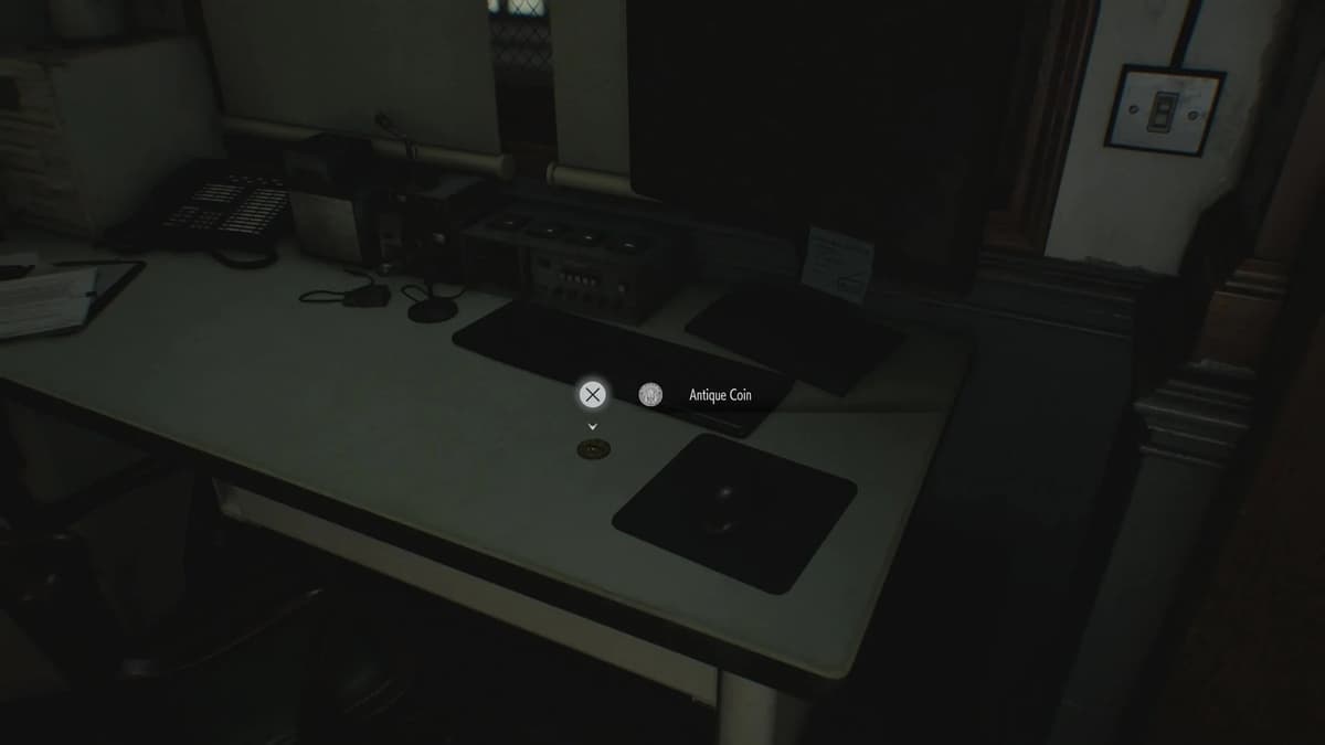 На первом этаже в Офисе охраны смотри на стол — монета лежит прямо там, рядом с мониторами. Охранники, похоже, древности коллекционировали.
