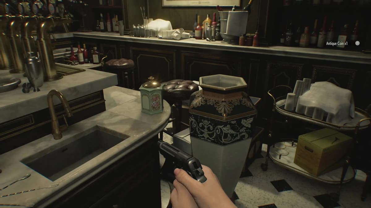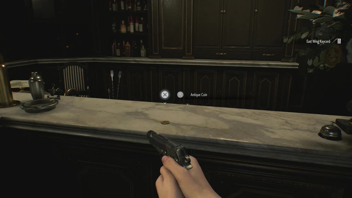 Второй этаж, Бар. Монета на пианино. Только аккуратно: Грейс случайно нажмёт на клавишу при взаимодействие с коллекционкой, и раздастся звук на весь этаж. Так что, если рядом ошиваются зомби — лучше сначала зачистить помещение. А то приползут на звук, устроят концерт.