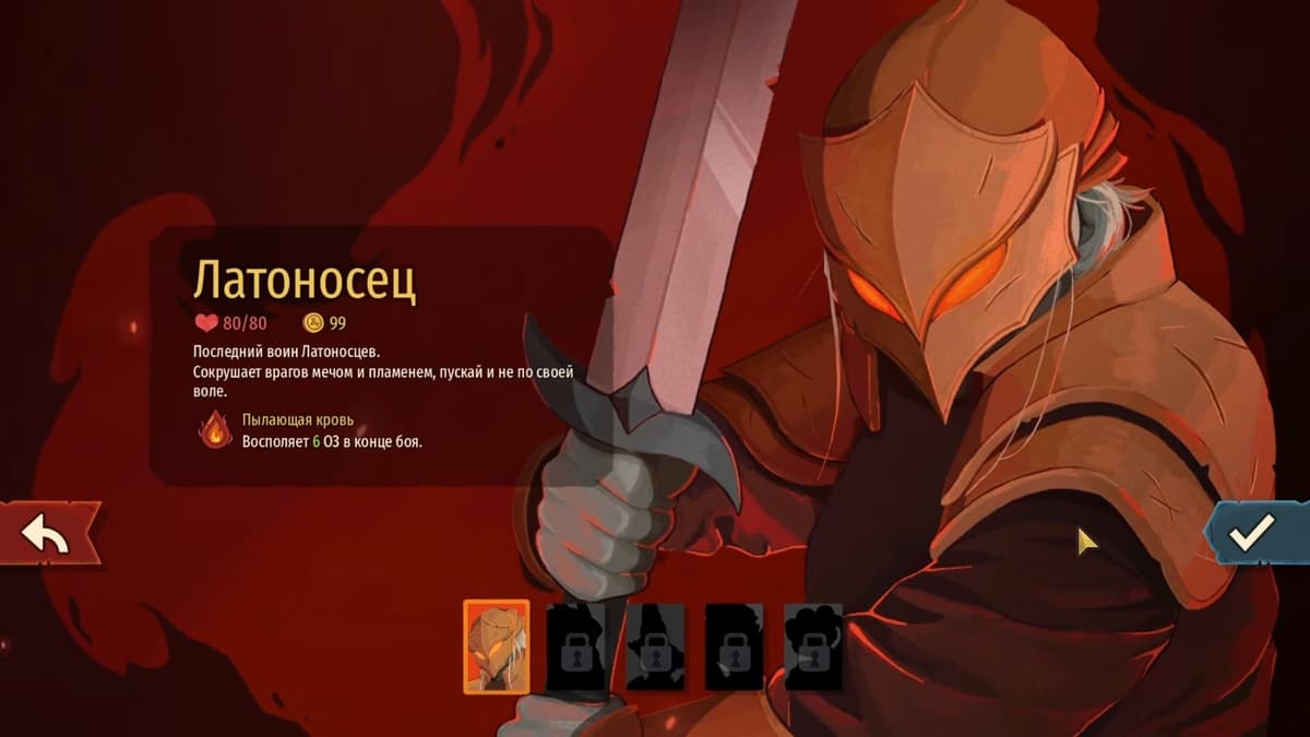 При выборе героя на экране будет показано его стартовое здоровье, запас золота и уникальную стартовую реликвию. У Латоносца, например, это Пылающая кровь (Burning Blood) — реликвия, которая восстанавливает 6 ОЗ в конце каждого боя.
