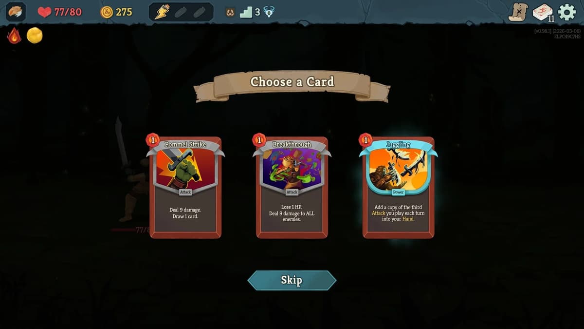 После победы, тебе предложат три карты на выбор, и чаще всего одну из них действительно стоит взять, а не пропускать награду.