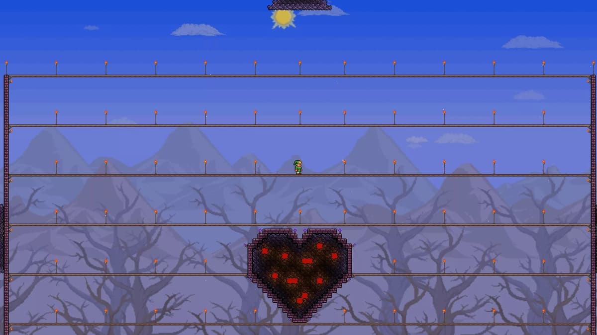 Глаз Ктулху приходит только ночью, и тебе точно не хочется драться с огромным летающим глазом в темноте. Поэтому сделай два высоких столба по краям площадки — примерно в высоту экрана — и повесь факелы по внутренней стороне. Также проложи факелы вдоль земли.