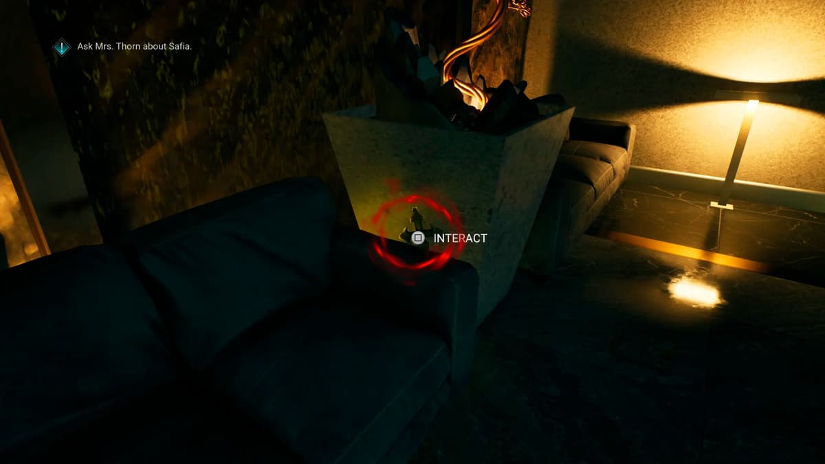 Башню ты посещаешь не раз: сначала карабкаешься по этажам, потом уже можешь кататься на лифте. На верхнем уровне выйди из лифта и иди вправо в тупик. Крест на правом подлокотнике левого дивана — ближе к цветочному горшку.
