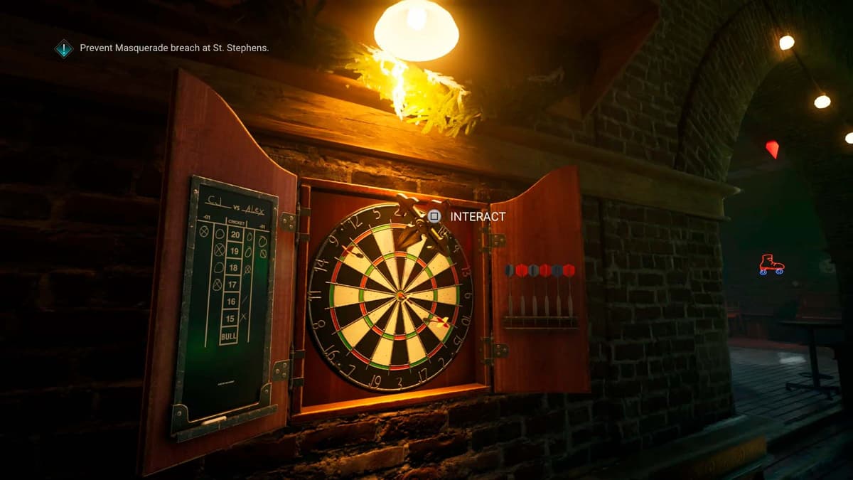 Ищи зону с дартсом у бильярдного стола. Крест воткнут в верхнюю половину правой мишени.